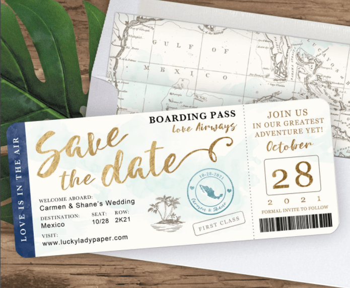 Now in regards to save the date cards… There are several great ones that I enjoy. But I will share with you guys the top two. I really like the boarding pass one. I am the nerd who keeps things like that from a trip. So that I may scrapbook it later. I still have a ticket stub that I friend of mine bought me for a concert that was about 10 years ago. Anyway… here we go.