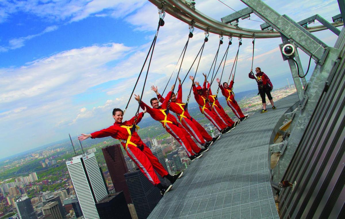 - Try EdgeWalk – This adventure is the first of its kind in North America and has you doing a hands-free walk around the main pod of the tower, 116 stories above the ground. (https://www.cntower.ca/en-ca/plan-your-visit/attractions/edgewalk/edgewalk-overview.html)