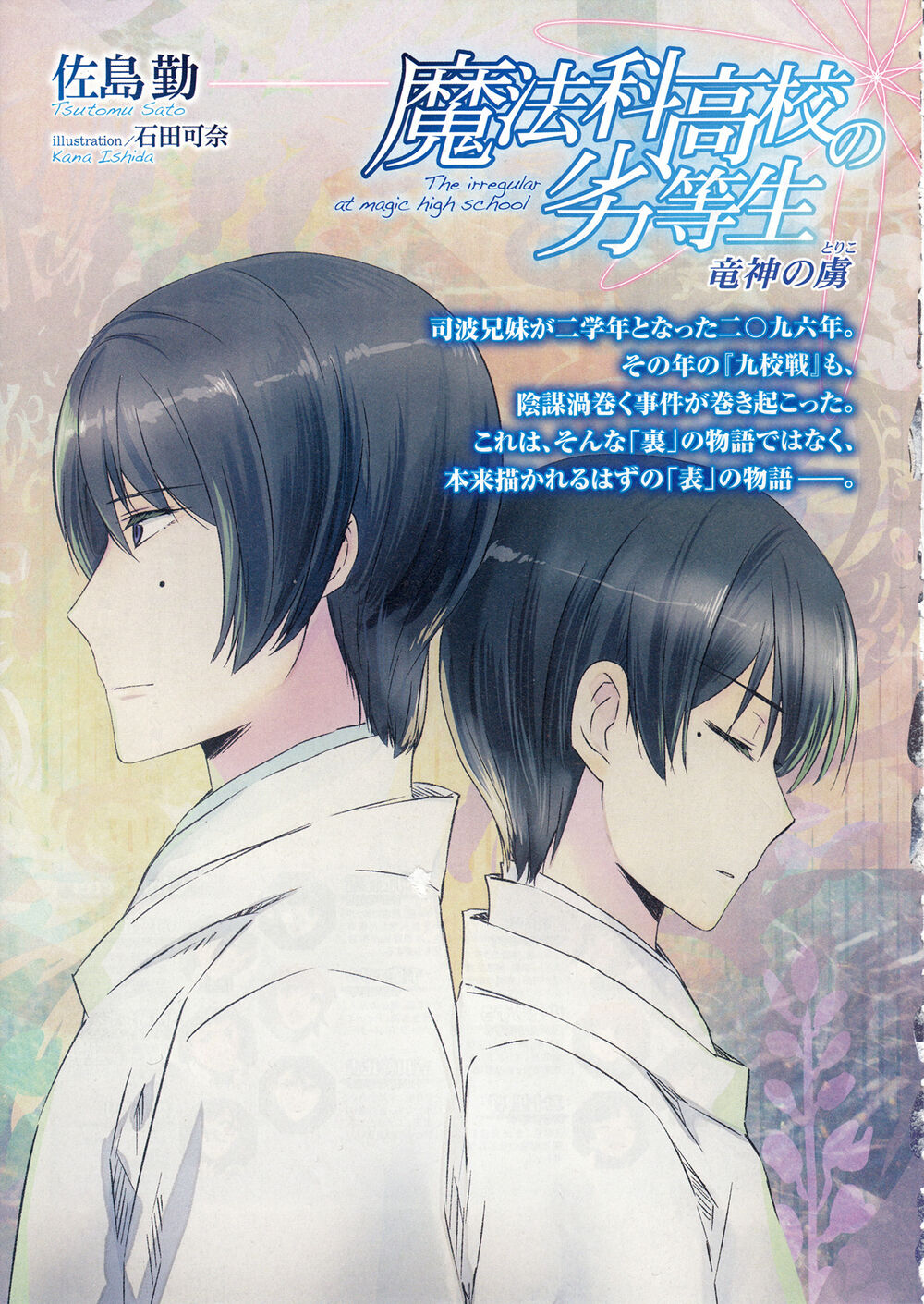 - Mikihiko’s Story: Prisoner of The Dragon God – Apparently it was published in Dengeki Bunko MAGAZINE Volume 41. It is a short story about Yoshida Mikihiko which takes place during the 2096AD Nine Schools Competition. Mikihiko reflects his current situation and upon an event in his childhood where he tries to summon a dragon. This short story was later released as part of the Irregular at Magic High School SS Light Novel.