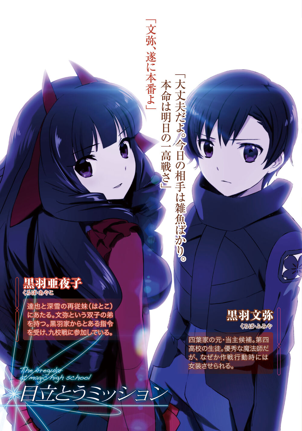 - Kuroba Twin’s Story: Mission to Draw Attention– Mission to Draw Attention was first published in Dengeki Bunko MAGAZINE Volume 43. This story focuses on Kuroba Ayako and Kuroba Fumiya who are given a mission by Yotsuba Maya to draw attention towards themselves and away from the Shiba siblings as they compete for Fourth High during the 2096AD Nine Schools Competition.