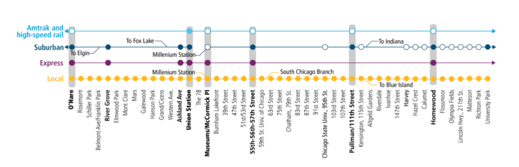 For businesspeople and conventioneers, CrossRail creates a fast, one-seat ride between O’Hare, Union Station, and McCormick Place. It makes it easy to get to the University of Illinois at Chicago, the University of Chicago, and Chicago State University. And, it gives visitors and locals alike easy access to Millennium Park, the Museum Campus, Soldier Field, the Museum of Science and Industry, the Obama Presidential Center, and the Pullman National Monument.