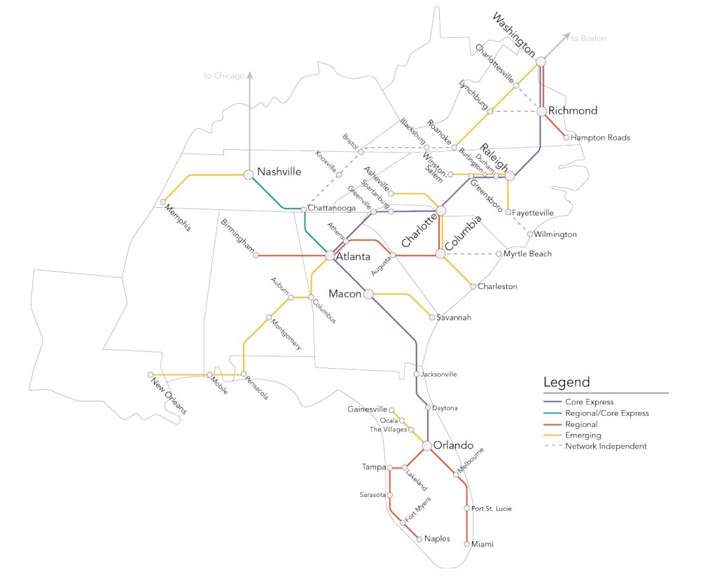 I read a blog about the Southeastern Rail Plan. The plan is a multi-state effort that progresses a long-term regional passenger rail vision for the Southeast. It connects the entire Southeast region and the core of the network for the SE Corridor is centered around the economic hub of Atlanta. From Atlanta, 3 high-speed lines would link the region: Atlanta to Tampa Bay via Jacksonville and Orlando, Atlanta to Nashville and Atlanta to Washington D.C. via Charlotte and Raleigh. This core service would carry about 70 percent of the region’s passenger rail travelers with service at top speeds over 125 mph. It would improve connectivity throughout the region and would strengthen the case for regional and emerging service. The entire network would then connect 70% of the region’s population directly to passenger rail, while improved transit and bus service could be built out to reach even more.