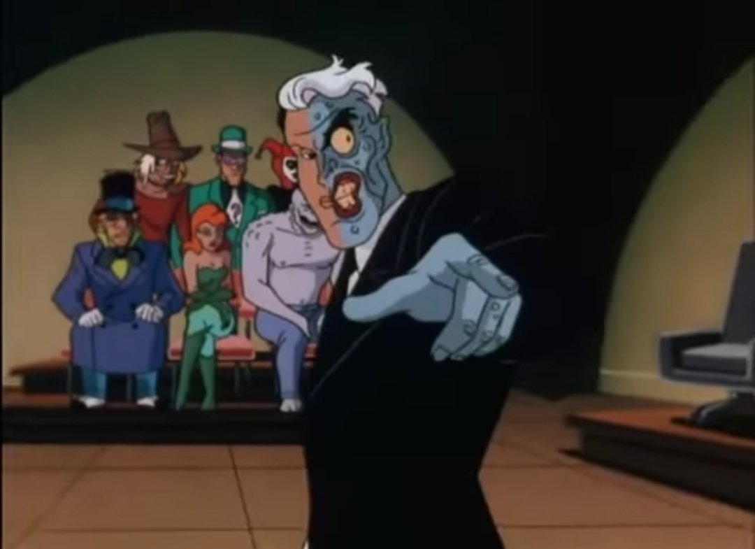 - Two Face 1 & 2 – Everyone knows that the prosecutor Harvey Dent becomes Two Face. Every iteration the story is a bit different. In TAS, Harvey is leaning on organized crime in Gotham City trying to get reelected. His re-election campaign proved so tiring that he started having violent outburst and they became more frequent, to the point where his psychiatrist recommended committal to a psychiatric ward in order to prevent a traumatic psychotic break. However, such an action would ruin his campaign and Dent instead compromised, agreeing to a reduced campaign effort and increased medical treatments. Rupert Thorne isn’t liking the extra police attention. Thorne decides to get all the dirt he can on Harvey even going so low as to dig through his psychiatric files. Thorne finds out that Harvey is suffering from multiple personality disorder (DID). Thorne knew if it was exploited it could ruin Dent’s career. When a fight ensued between Dent and Thorne’s cronies, a freak explosion destroyed the left side of Dent’s body. The trauma was powerful enough to force his alternate personality to dominate, and left in state where right and wrong no longer held any meaning. Bruce is left feeling like he failed his friend… Just like his parents. In part two of the episode, with his new identity Dent started a crimes’ spree against Rupert Thorne. He also started using a double head coing with one of the sides scratched to act upon. Every decision Two Face made fell on the flip of this coin. Two-Face attacked several of Thorne’s fronts causing Thorne to lose substantial money. When Two Face decides to return the favor to Thorn and blackmail him. Batman of course saves the day. But you end up feeling bad for the Bat because he did all he could… and you feel bad for Harvey. He was a rising star and now he is just another criminal.