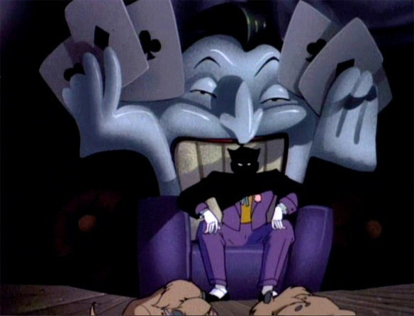 - Mad as a Hatter – This episode introduces The Mad Hatter to the show. The villain was rarely used in comics and his appearance on the series helped improve his portrayal in the comics. Jervis Tetch develops a form of mind control which he implements by placing devices in people’s hats. He uses this to impress Alice, a woman he’s attracted to, turning all of Gotham City into a wonderland to please her at every whim. When he learns she’s in love with another, the jealous Tetch decides to use his mind control power to do away with her, emulating a figure he idolizes: The Mad Hatter. Jervis Tetch is a scientist who works at Wayne Enterprises on a project on using microchips to increase the brain’s potential. Tetch has developed a technology that allows him to control the minds and bodies of any animal or person he wants by using micro-chips attached to his brain and to the other person. Alice enters the laboratory to announce the unexpected visit of the head of the WayneTech division Marcia Cates, and Wayne Enterprises owner Bruce Wayne. Tetch is embarrassed to tell them that the project isn’t complete but Bruce Wayne thinks it is fine and gives the man more time despite Cates displeasure. Tetch starts feeling down and Alice cheers him up, but in doing so, Tetch develops a romantic feeling towards Alice which would be turned awry when he learns that she is in a relationship with a man named Billy. Tetch falls into a depression and he starts to think about forcing Alice to like him using his mind-control device. Later he learned that Alice had argued with Billy and they had broken up and he takes the chance to invite Alice to spend the night with him in Gotham. Tetch uses his mind-contol device to make the people in Gotham do what he wants and pretends to be a well known man in the city. When the couple are at the park, two goons try to mug them but Tetch uses his controlling cards and tells them to jump to the river. At that moment, the police radio sends the message to all the units about two men climbing the Gotham bridge above the river. In the Batcave, Batman examines the cards and remembers that his employee, Jervis Tetch, was working in a similar project at WayneTech. Alfred also indicates that the card is too similar to the one depicted in a book of Alice in Wonderland. Batman also remembers that he saw the same illustration at Tetch’s laboratory. (I don’t know anyone that has an even a passing interest in that story. Maybe I should read it but I only know what I know from the movie.) The next day, Tetch arrives at his office and learns that Alice and Billy are together again and that they were going to get married. Tetch is angry and when Marcia Cates tells him that Bruce Wayne is looking for him, he uses one of his cards to control her. A few moments later, Bruce personally arrives at Tetch’s office and asks Alice for him. Alice tells Bruce that Tetch and Cates had left the building together some time ago. Alice then receives a phone call from Billy and after she hangs the phone, she starts crying disconsolately. Bruce becomes aware that all the events are a bit weird. It is later revealed that Tetch is controlling Billy and he made him call Alice and tell her what Tetch wanted. When Alice arrives at her home, she finds that it has been covered with big flowers all over the place. Tetch is waiting for her but she is scared of him and at the fact that he knew about Billy when she didn’t tell to anyone. Batman appears from the shadows and questions Tetch about his experiments and then Tetch calls two mind-controlled men in disguise to fight Batman while he takes Alice with him using his mind-controlling cards. The Mad Hatter takes Alice away from there and Batman follows them into a maze of cards. After struggling for a while Batman finds his way out and confronts Tetch in the tea table of Wonderland. Tetch drops one of the maze’s walls on Batman and gets ready to strike Batman, when the dark knight used his Batarang to cut the rope of a hanging statue above them. The statue falls to the ground, leaving Tetch trapped inside and Batman takes the top hat, removes the mind-controlling device and destroys it. Alice is free of the mind-control and she and Billy are reunited much to The Mad Hatter’s sorrow. (So as a kid… I missed the implications of what Alice was going though… that I and many women face as they move through life. Tetch is a stalker and thinks he is entitled to be with Alice whether she wants to or not. So much for the “nice” guy.)