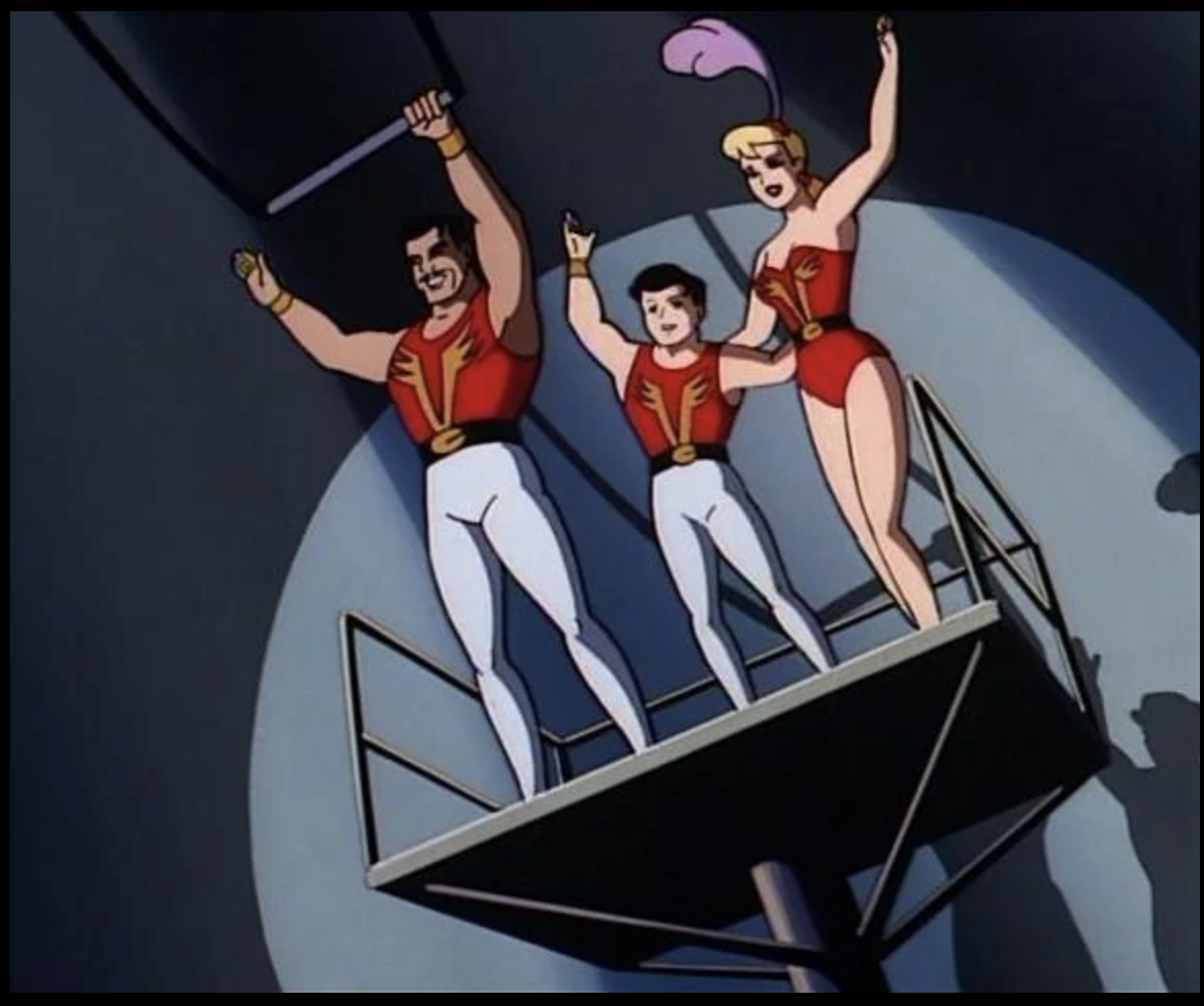 - Robin’s Reckoning 1 & 2 – Both episodes are notable for showcasing the origin of Dick Grayson and how he came to be Robin, Batman’s sidekick. During a fight with some gangsters at a construction yard, Batman and Robin learn the name of their boss: Billy Marin. While Robin looks forward to going up against Marin, Batman becomes distant, and after a falling out at the Batcave, Batman doesn’t allow Robin to accompany him on the search for Marin. Seems the Bat knows something that we don’t. Robin wonders what happened for Bruce to act that way and he decided to investigate about Billy Marin in the Batcomputer’s files. Robin discovers that Billy Marin is an alias used by Tony Zucco; the man responsible for the deaths of John and Mary Grayson; Robin’s parents. It is the flashback that threw me (even as an adult.) Batman is dark… knowing that Dick’s parents are dead is one think… seeing that they were murdered is another. It was done in a great way for kids… but still jarring. Would I want revenge????? Definitely! Was Batman going to be able to start Dick from going down a slippery slope? I had so many questions. Robin calls Batman and tells him that he deserves to apprehend the man who caused him so much pain but Batman refuses to let him in the case. For this reason, Robin decides to get into the action by himself with or without Batman’s approval. Robin then remembers the time when, as a kid, he went out to the city looking for Zucco’s place after hearing a conversation between Lieutenant Gordon and Bruce. Robin becomes more focused on finding Zucco and he goes to check on the place of Zucco’s captured henchman. Robin uses a tracking device in the telephone and he calls the last dialed number. Zucco answers and Robin learns his address thanks to the tracker. Zucco is freaking out because of the Batman and he tells his henchmen that the bat is following him. Zucco notices some weird noises coming from the ceiling of his hideout and he starts shooting the roof with a machine gun. After the gun is depleted, Batman falls from the ceiling and hurts his leg in the fall. Using a smoke pellet, Batman escapes from the place and walks to a nearby abandoned amusement park. Zucco and his men follow Batman and separate to find him. At that moment, Robin is rushing to the place and Batman has to fight the three of Zucco’s henchmen with an injured leg. Robin arrives in his motorcycle and draggs Zucco across the pier. Robin is mad at Zucco and gives him a proper beating before throwing him off to the end of the pier. Robin is not sure whether to kill Zucco or hand him to the police, but Batman arrives and tells him to stop. Robin snaps at him, insisting that Batman can’t know know how he feels, but immediately realizes who he has just said this to, and apologizes. Robin lets the police take Zucco.