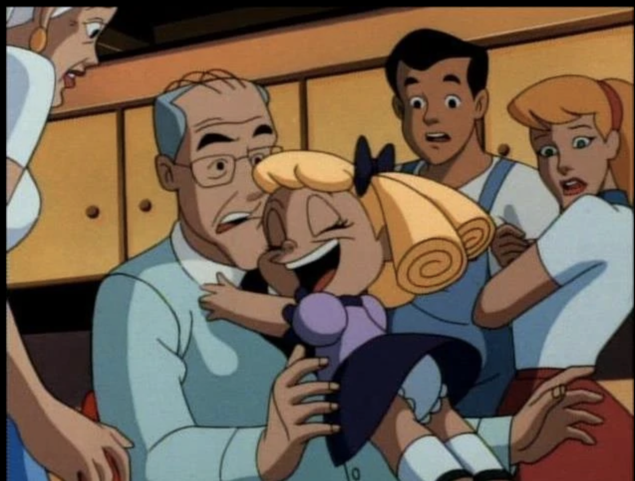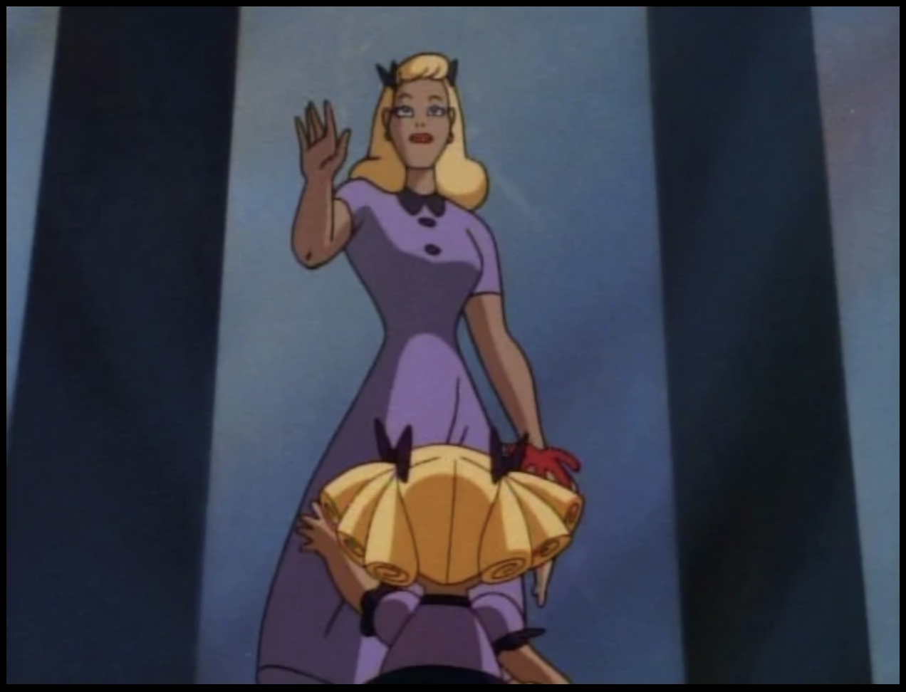 - Baby Doll – It is notable for introducing the original character Baby Doll to the series, although it is her only appearance in the show. She does get re-used with a new appearance in New Batman Adventures though. A former child star, now grown bitter and insane, kidnaps her TV family and holds them prisoner on an abandoned sound stage. After finishing a play, some actors get out of the theater through the back door and a young actor notices a little girl crying on the corner of the alley. She tells him she’s looking for her big brother. When he glances at her you can see the recognition on his face before he is attacked from behind and knocked unconscious. A few days later, Commissioner Gordon calls Batman and Robin to discuss the recent abductions of actors that used to work on an old sitcom called “Love that Baby”. The main character was a little girl by the name of Baby Doll, who was portrayed by Mary Dahl, an actress with a pyhsical condition that prevented her body from aging and thus she looks like a child. Gordon informs them that until that moment, three of the main actors have been abducted. Gordon informs them that until that moment, three of the main actors have been abducted. The youngest woman of the cast is being abducted and the police can’t get a handle on the situation. Batman and Robin arrive in time to stop the couple of thugs, but when they think they’re safe, a big truck comes into the alley, crashing against the police cars and the vigilantes. The woman is placed inside the truck and the thugs get away with her. Batman and the boy wonder are in hot pursuit. However, Batman stops the car as he notices a little girl on the way and forces the car to crash against some crates on the street. The little girl is scared and looking for her mom and a few seconds later, a woman comes and takes the girl away. Batman recognizes the voice and when he talks to her, Baby Doll uses an exploding ball to create a smoke screen and get away. Knowing that Dahl is responsible for the abductions, Batman and Robin go to Summer Gleeson and ask her for a couple of her documentary episodes on the TV show where Dahl used to perform. the kidnapped actors find themselves in a recreation of the old set for the TV series and Baby Doll tells them that they are going to be a happy family again. With help of a couple of thugs and her personal bodyguard, Dahl prevents the other actors from leaving the place. Batman and Robin learn about the tragic acting career of Dahl and they realize that she might be holding a grudge against her peers for that. However, it was Dahl who decided to leave the TV series after the producers introduced a new character that upstaged her in camera. When she failed on other acting roles, she wanted to go back to the series, but the producers wouldn’t accept her offer and the show was officially cancelled. Batman and Robin realize that Dahl hasn’t kidpapped the actor who upstaged her and they deduce that he might be the next victim. The next day, Spunky, the former kid actor and now musician is playing guitar in his garage when a woman crosses in front of his place with a baby carriage. She approaches Spunky and tells him to lower the volume of his music since her baby needs to take a nap. Spunky tells her that he needs to practice, but from the carriage comes Baby Doll and uses knockout gas on him to capture the last member of the cast. Baby Doll recreates the last episode of the series, where she celebrates her birthday, but this time, the actors are tied to the chairs and the candles of the birthday cake have a dynamite among them. Dahl first pushs Spunky face into the cake..and then lights a dynamite stick ..she plans to “stay” with her family forever ..by killing both her “Family”…and herself. Spunky is the one to blow the candles out and he grabs the dynamite with his teeth and tosses it away from them. When the dynamite explodes in the next room, it creates a big smoke screen and from it comes Robin, who was disguised as Spunky in order to save the real Spunky and to learn Dahl’s secret hideout. Batman arrives at the scene and with Robin’s help, they incapacitate Dahl’s henchmen and untie the actors. Dahl runs away and tells her bodyguard to take care of the duo. Dahl runs away to a nearby fair, where she tries to merge with the people in the crowd. Batman tries to find her by looking from the highest point of the place, but there is too many people to locate her. Batman tries to keep up with Dahl, but her little body allows her to get in small places and move faster than Batman. He tries to explain her that he understands that she must be feeling confused and that he wants to help her. Dahl doesn’t believe him and she runs towards an abandoned house of mirrors, where she is overwhelmed by her own image reflected in all the mirrors. Dahl walks to the final mirror, which reflects her as the adult woman she could have been and suddenly she feels joy. However, she realizes that the reflection, just like her TV family, and everything else in her life, is not true. Realizing that she can never have either a normal family or a normal life, Dahl starts shooting all the mirrors until the only one left is the one with her adult image. Suffering an emotional breakdown for the life she will never have, Dahl breaks down and shoots that mirror as well and she keeps pulling the trigger, even though her gun has ran out of bullets.
