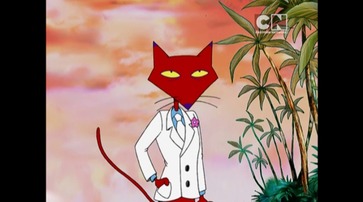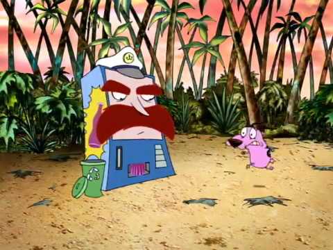 - “Klub Katz” – After reading an ad for a cruise line, Muriel decides the family should go on vacation. While Courage is enthused by the idea, Eustace refuses to leave his chair, so he takes it with him. (I really would have left him in Nowhere.) On the boat, Courage gets sea sick and vomits into a pipe that leads directly to the engines. This happens to clog them just as the ship ends up en route to an iceberg. The passengers panic, but the ship sustains no damage. However, the incident is immediately followed by a massive tidal wave that overtakes the vessel, sending it underwater. The Bagges find themselves shipwrecked on a tropical island. Eustace is angered by the loss of his chair in the crash, but Muriel thoroughly enjoys the atmosphere of the beach. Meanwhile, a mysterious figure watches them from the bushes. Unable to sleep due to horrific mechanical noises coming from the jungle, Courage stays up all night carving coconuts. The next morning, Katz, revealed to be the mysterious figure from the night before, shows up on the shore and introduces himself to the Bagges as the owner of a five star resort, “Klub Katz.” The couple falls for the charade, but Courage is suspicious. (It blows my mind that they seem not to remember Katz from his last fiasco.) Falsely sympathetic of their accident, Katz offers to bring the family to his spa to relax. On the way to the spa, Courage stops at a soda machine that turns out to be the Captain of their wrecked cruise boat, who warns the dog to leave the island. Courage attempts to convey the warning he just heard to Muriel as she and Eustace approach Katz’s spa, but of course they don’t listen. (“They never listen.” – My niece, Age 6.)Courage is denied entry to the spa by a reminiscent “No Dogs Allowed” policy, Eustace ties him to a tree outside, and the two enter. Within seconds, screams are heard from the inside. The dog frees himself, but only in time to see Eustace, in the form of a wrecking ball, and Muriel, in the form of a washing machine, being taken away by Katz to a colosseum. He follows, and witnesses his two now-mechanized owners being pitted against each other for Katz’s amusement. Courage then rushes back to the spa and transforms himself into a helicopter. He intrudes on the brawl and rescues Muriel. Seeing that Katz is in his chair, Eustace sweeps his ball at Katz destroys his beloved seat as Katz dives out of the way. As Muriel and Courage escape, Eustace chases Katz and wrecks his Klub, along with the entire island, in a heated rage.