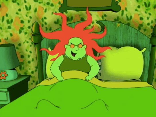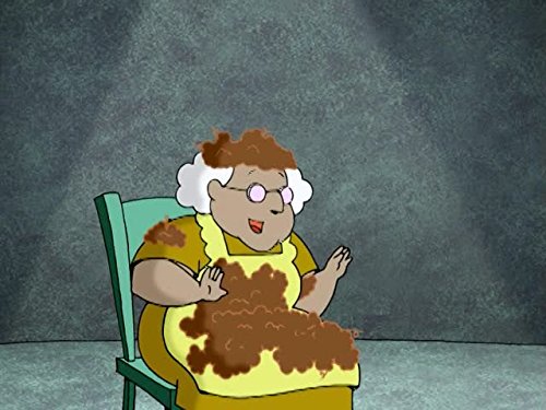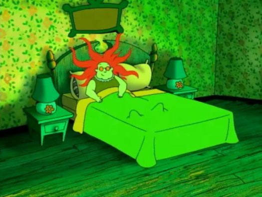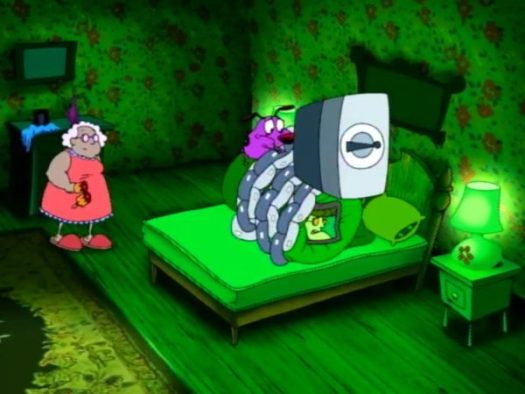 - “The Demon in the Mattress” – My sister and I laughed so hard at this one mostly because we are older adults and understand the need for a great mattress. After many sleepless nights, Muriel orders a new mattress. Muriel pays no mind to the grotesque-looking deliverymen (who hiss at Courage) that arrive on a sinister horse-drawn carriage, or the demonic face that appears on the mattress, and gladly accepts it. There is really something scary about how Muriel seems oblivious to danger… and this seemed pretty straightforwardly a bad idea. Muriel heads upstairs and lies down on the new mattress, locking Courage out of the room. Courage peeks through the bedroom window on a ladder and witnesses strange green vapors being emitted from the bed and possessing Muriel. She suddenly levitates above the bed, and as Courage watches in horror, he falls off the ladder. Courage tries to explain his fear to Eustace, who of course fails to pay attention. Courage takes Eustace upstairs where they see Muriel transformed into a demon with fangs and wild, constantly flowing red hair. The other funny thing…. Courage has to work with Eustace to save Muriel. Courage engages in a thumb war with the demon and loses, then flees from the room. Courage looks up on the computer how to get rid of the demon. It prints out an incantation for the demon. After Eustace’s failed attempt, he gets vomited on by the demon, Courage then performs the exorcism from the computer and the demon deposseses Muriel. Then, Eustace comes in wearing a hazmat suit, and tries to perform the exorcism, but the demon possesses him instead. Muriel whacks him with the rolling pin, then she and Courage roll him up in the mattress and put a lock around it, and the mattress gets taken away by the evil deliverymen. Incantation to exorcise a demon: “Hullabaloo and howdy doo! Musty prawns and Timbuktu! Yeltzy bye and hippity hoo! Kick ’em in the dishpan! Hoo hoo hoo!”