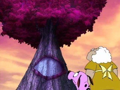 - “The Magic Tree of Nowhere” – Eustace is usually a turd. In this episode he takes it up 10 fold. A company called Farm and House has delivered Muriel’s kitchen curtains, as well as a complimentary packet of seeds. Eustace claims that nothing has grown at the farm in 50 years, and throws the seeds out the window, where it destroys Courage’s sand castle. While upset over the destruction of his sand castle, Courage plants the seeds anyway. A rain cloud appears out of nowhere, and showers Courage and the soil. Just the area where he planted the seeds. A flower blooms, then rapidly evolves into a big tree, complete with beautiful flowers. Muriel is amazed, but Eustace is angered that Courage could grow something and he never could. (I discovered that Eustace is jealous. Jealous of having to share Muriel with Courage… ) Muriel’s pie is burned in the kitchen oven, and she wishes for a new oven. Courage, while wearing a gas mask, notices that a new oven has appeared next to the tree. Muriel’s pie is burned in the kitchen oven, and she wishes for a new oven. Courage, while wearing a gas mask, notices that a new oven has appeared next to the tree. Courage is playing with his toy construction vehicle, but it breaks. He wishes for a real construction vehicle, which spawns next to the tree. Courage and Muriel are then shown having great fun in the vehicle, digging up dirt and dumping it elsewhere on the farm. This wakes up Eustace, who comes out of the window and exclaims that he is trying to take a nap. Frightened, Courage accidentally dumps the dirt on Eustace, who is heard muttering “Stupid dog.” Later, while Muriel and Courage are sitting outside next to the tree, Eustace intends to go to the picture show, claiming that he isn’t wanted around the farm. Muriel wishes that she and Courage could see a movie, and this causes a projector to form out of the branches, which starts playing a horror movie. Eustace notices this from the truck and tries to ram it into the tree. Muriel stops him, and explains that the tree is providing for them, which Eustace says is his job. when Muriel and Courage have gone to bed, Eustace comes back out to take the rocking chair inside, insults the tree, and wishes that Muriel had a bigger head so that “she’d know better.” The next day, Muriel is laying on the couch with an extremely engorged head. Worried (not because of Muriel but because he is hungry), Eustace calls Dr. Vindaloo. The doctor explains that it is the worst case of “boli-boli” he has ever seen. He does “everything known to medical science”, which involves a rubber glove, a mallet, a huge pair of scissors, and a wrench. The doctor tells them that there is nothing to worry about, but there is nothing he can do about it and exits the house, while Courage and Eustace look at him, dumbfounded. Courage howls in desperation, but Eustace says that it is all his fault for bringing the tree, and now he has to get takeout for breakfast. Courage starts saying “help” to the tree, and this causes the tree to start speaking to him, which scares Courage to the point that his skin flies off his skeleton. The tree tells him to not be afraid and that it has the cure for Muriel. It will take 3 days, but by then, the tree predicts it will be cut down, much to Courage’s dismay. Courage learns that Eustace plans to chop down the tree with an axe. Courage uses the vehicle he obtained earlier to dig a moat around to defend the tree. He obtains a packet that makes a singing eel appear, then finishes by building a giant sand castle around the tree. Courage spends the day fighting off Eustace… and his attempts to cut down the tree. It is pretty funny to see Eustace in pain. Courage is exhausted, but then gets a call from the doctor, saying that he has the cure. Courage drives to the office, where Dr. Vindaloo gives him a cure that “will cure your broken leg”. Meanwhile, back at the farm, Eustace confronts the tree, who asks if cutting him down will make Eustace feel more important around the farm. Eustace thinks about it for a second, then says “Yes!” A skeptical Courage races back to the farm, where he discovers that Eustace has chopped down the tree. the tree comes back to life one last time to tell him that the actual cure for Muriel is composed of the flowers from its branches mixed with pure hornets honey. With those final words, the tree dies. Courage gets the cure to Muriel, whose head returns to normal. Sometime later, a flower is shown to be growing from the stump of the old tree and it will regrow, while Muriel pats Courage on the head. Eustace is then shown lying on the couch, also with an engorged head as revenge for chopping down the tree. He closes the episode asking “Is the tree growing back yet?”