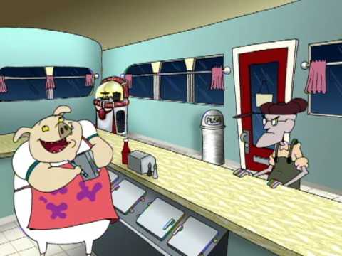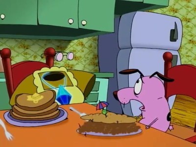 - “Heads of Beef” – Muriel is sick and unable to make dinner for Eustace and Courage. Eustace decides to go out for a bite to eat after asking Muriel for dinner and getting no response. Muriel asks Eustace to go to the bakery on his way and get her scones, then asks Courage to join him so he won’t forget. (2 things… Again… how could Muriel be married to him? Like what does she see in him? Also… you know that Eustace is mean to Courage. Why are you sending the dog with him?) On the way there Eustace discovers a restaurant that serves burgers for a cheap price (called “Burgers, Really Cheap!”). Inside the restaurant, Courage and Eustace see a lone gentleman eating a burger whereupon the owner, Jean Bon appears to greet the duo and take their order. The lone gentleman asks to go to the bathroom and Jean Bon directs him to a door. Courage gets suspicious when he sees that the gentleman doesn’t return after using the restroom and Jean Bon grabs the belongings of the gentleman from the counter. Courage grows even more paranoid when he sees the face of the gentleman molded onto his own burger. When Courage attempts to warn Eustace, Eustace merely rebuts his warnings. Courage then heads into the door where the gentleman entered in order to investigate. Further adding to Courage’s paranoia he overhears the conversation of Jean Bon and his wife where they discuss Courage and Eustace. Upon hearing this conversation Courage runs away and attempts to warn Eustace again who rebuffs his efforts. Jean Bon then appears attempting to talk to Courage, which causes Courage to run and fall into the basement which was behind the door. Courage sees the shadow of Jean Bon’s wife eat what appears to be the head of the lone gentleman, which causes Courage to finally try and escape from the restaurant. After knocking out Jean Bon, Courage runs and tries one final time to beg Eustace to take him home. After failing Courage then escapes the building all the while being chased by the Jean Bon’s Wife. At home Courage is sitting next to Muriel frightened who tells him not to worry about Eustace. At the restaurant a shadow of Eustace’s head is cast onto the wall. It is then revealed that the lone gentleman is alive and well, is the curator of a gallery of culinary wonders, and that the head of Eustace is merely a bust of Eustace made of hamburger meat. Eustace is shown healthy as well, and that the whole ordeal was merely a product of Courage’s paranoia.