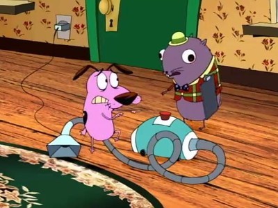 - “Human Habitrail” – Muriel is cleaning and Eustace is trying to eat dusty soup. No Seriously. Dusty soup. and just as Muriel gripes about the dust, Dr. Gerbil, a mad scientist posing as a travelling vacuum cleaner salesman, knocks on their door. He offers Muriel one of his products free of charge, but instead of cleaning dust, the vacuum shrinks Muriel and Eustace and contains them inside the dust bag. Dr. Gerbil then takes them to his underground laboratory, where he performs several disturbing experiments on them, so that he can improve his line of products. (His weird products. And Weird is an understatement. Once again, Courage must save his family, but in order to do so, he must endure a seemingly never-ending tour of Dr. Gerbil’s cosmetics line…