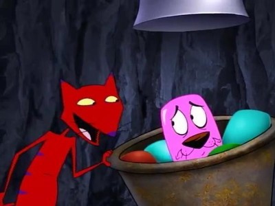 - “Katz Kandy” – Muriel and Courage are making candy apples in preparation for the Nowhere Sweet Stuff Contest. Meanwhile, Katz has developed a living jam monster to kidnap Muriel and coerce her into revealing the secret ingredient in her candy apples. Once the candy apples are finished, Courage answers a knock on the backdoor. The jam monster attacks them and carries the both of them to Katz Kandy, a candy shop run by Katz. Eustace comes home for dinner and notices a trail of purple jam leading out the door, which he starts licking up and following. (He really only notices because he is ready for dinner.)The jam monster throws Courage and Muriel into the basement, where Katz comes to meet them. Katz then shows why he brought them there, revealing that he keeps placing Second in the Nowhere Sweet Stuff Contest. Katz tries to force Muriel to reveal her secret ingredient by placing her onto a giant candy cane above a taffy-puller. Meanwhile Courage is bound in bubble-gum to a stone wall. Katz explains that if Muriel doesn’t reveal her secret ingredient, he will pull a lever which will drop Muriel and the candy cane into the taffy-puller, killing her presumably. Courage chews through the bubble-gum and uses it to blow a bubble to float up to Katz. The bubble pops when it hits the ceiling, dropping Courage onto Katz, which prevents him from pulling the lever. Eustace arrives at Katz Kandy where the jam monster attacks him. Down in the basement, Katz allows a “small spot of sport”—a staring contest—before Courage “goes bye-bye”. Courage immediately begins to suffer. (Anytime there is a battle with Katz…. Courage seems to have such a hard time.) Eustace scares away the jam monster with his iconic “OOGA BOOGA BOOGA!” mask and goes down to the basement. Eustace’s arrival startles Courage, causing him to blink and lose the game. Katz throws Courage into a giant jujube maker, turning him into a purple jujube. Eustace complains about dinner and asks Muriel in a confused manner why she is walking around without her boot, but Muriel demands that he get her away from the taffy-puller. Eustace reaches Muriel (He is actually helpful… I am shocked.) and Katz pulls the lever, nearly turning them into taffy. While Katz and Eustace are fighting on the candy canes, Courage rolls up the stairs and rams the lever, which drops Katz into the taffy-puller. Katz, now being pulled into taffy but still being alive, still demands to know Muriel’s secret ingredient, and she reveals that it is vinegar. In the end, Muriel and Courage win 1st place in the 43rd Annual Nowhere Sweet Stuff Contest, while Katz receives his usual 2nd place.