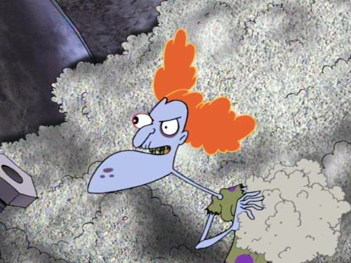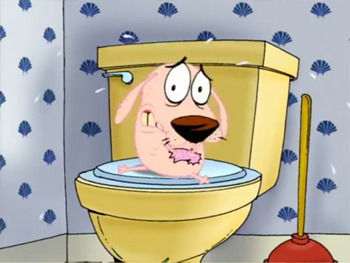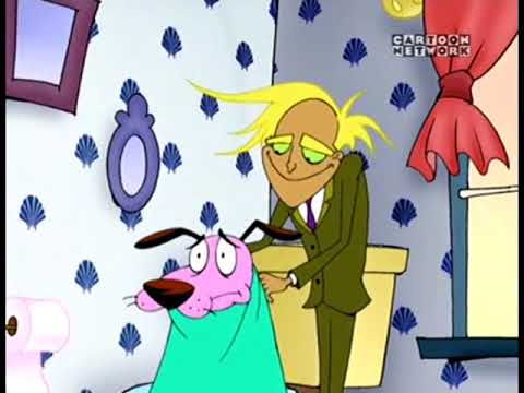 - “Freaky Fred” – This by far is the funniest episode of the bunch. The fact that is narrated in this rhyme…. makes it even better…Fred says “naughty” 14 times. And it never fits into the rhyme. It has also become a popular Internet meme. This is one of the few episodes in which neither Eustace nor Muriel fell victim to the antagonist. Fred is Eustace and Muriel’s nephew who visits. He is known as one of the most memorable antagonists on the show. Though Muriel seems quite fond of him, Courage is terrified of him. Eustace calls him “Freak” and said in reference to him: “The freak’s a barber, a freaky barber, with his own freaky barber shop, where freaky things happen, freaky barber things.” Muriel’s seemingly odd nephew Fred is coming for a visit, much to Courage and Eustace’s chagrin. Fred begins the episode introducing himself to the viewers in the form of a poem, while riding on a bus to the middle of Nowhere. He tells us that “the words (we) hear are in (his) head” and that he’s been very “naughty.” Fred then arrives at their farmhouse and is waiting at the door while Courage imagines all sorts of horrible things that he could be. Instead of all the things Courage fears, there stands a polite, yet strange man with a British accent, which scares him more than any monster he imagined. Courage notices a wristband on Fred’s wrist for a “Home for Freaky Barbers” with a contact phone number, he tries to call Muriel’s attention to it. Instead, Muriel has Courage show Fred to the bathroom so he can freshen up after his long trip. While Courage nervously waits outside the bathroom door, Eustace deliberately throws him inside and slams the door, locking both Fred and Courage in. Eustace leaves, and instead of going to the hardware store like he said he would, he goes to various other places (such as the beach and the movies) during the rest of the episode to stay away from Fred. As Courage cowers, Fred begins to tell Courage of how he first realized his compulsion to cut hair. Which started with the story of his pet hamster. He then starts preparing to shave Courage. Desperate, Courage hides in the toilet, but Fred finds him anyway and pulls him out. During his reminiscing he’s already used his trimmer to give Courage a Mohawk. This prompts another memory, this time of his former girlfriend, Barbara. Trimming more fur from Courage, Fred reveals they eventually broke up due to him shaving her bald. He continues to psychotically shave Courage. He goes on to say how he tried to control himself, but inevitably gave in. Once again, Courage tries to escape, this time by going down the sink drain, but is only half-way there (and half-way shaved) before Fred pulls him out. However, before another flashback, Courage grabs the wristband free. When a long bearded man arrived at his barber shop one day, Fred once again gave into his compulsion after the man saying asking only for a small trim . Afterward, it’s assumed he was admitted into the Home for Freaky Barbers. He proceeds to shave Courage bald except for his tail. Taking an opportunity, Courage manages to dial the number. Sirens are heard in the background and Fred gets up to look out the window. Then he sighs, realizing he’ll have to go back to the mental home. Orderlies break down the door. Restraining Fred in a straitjacket, they then escort him into padded van. This episode is a parody of the musical Sweeney Todd: The Demon Barber of Fleet Street, about another crazed barber. However, while Fred does display a rather bizarre obsession, he shows no other psychotic tendencies, unlike Todd, who sought to punish the wicked or be “merciful” to the innocent by killing them.