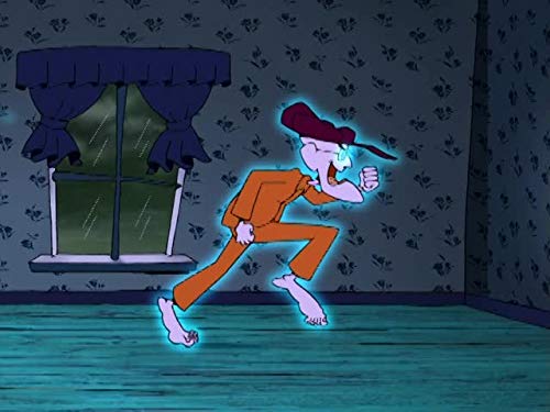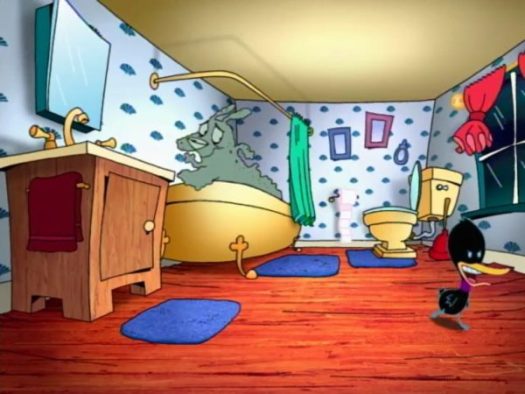 - “A Night at the Katz Motel” – This has to be my favorite Courage segment. I enjoyed anything that included Katz… While on their way home from a trip, Muriel and Eustace Bagge with their dog Courage become caught in a storm, forcing them to stay for the night at the Katz Motel on the side of the highway. It was one of those creepy hotels that no person would want to stay at in the day time… “This looks like a crummy place to end a crummy vacation.” — Eustace. They are welcomed by the proprietor, Katz, who reveals that canines are strictly prohibited. “Welcome to the Katz motel, I’m Katz.” Creepy dude. (First red flag). Courage is forced to sleep outside the motel, while Muriel and Eustace attempt to settle in for the night. The audience is shown that Katz… is the keeper of giant, man eating spiders. An unseen figure, presumably Katz, unleashes an enormous spider on Courage, before dropping another in Muriel’s bath through the faucet. Courage barely escapes and begins searching for his owners, while Muriel is ambushed by the spider in the bathtub. Muriel instructs Courage to wake Eustace… who has disappeared. Courage discovers Eustace has disappeared and quickly goes to the lobby to get help, only to discover it empty. Upon further inspection, he discovers another room covered in spider webs, with an unconscious Eustace about to be consumed by a larger and deadlier spider. Courage pulls up a loose floorboard and crushes the creature underneath it, before rescuing a still sleeping Eustace. While Courage makes his escape carrying the still sleeping Eustace, Katz appears and blocks the way out, forcing Courage to toss Eustace’s bound and unconscious form on him. Courage hides in the motel’s basement, only to discover it is where Katz stores the spiders. A terrified Courage bursts through the door, knocking it loose from its hinges and onto an awaiting Katz, who quickly recovers. He corners Courage in a part of the basement and forces him to play a game of handball for his freedom. (Funniest turn of events… I was not prepared.) Meanwhile, Muriel is able to knock the spider into the toilet, flushing and drowning the creature. Katz triumphs over Courage in the game and proceeds to smother him with one of his spiders. However, Muriel appears and strikes Katz over the head with a badminton racket, dazing him and rescuing Courage. An irritated Muriel drives her dog and husband away from the motel, complaining about the awful service.