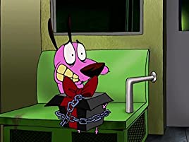 - “Shirley the Medium” – A locked box left behind by Eustace’s late brother, Horst, defies the every attempt to open it. While digging in the yard, Courage discovers a locked box that belonged to Eustace’s dead brother, Horst. The box contains money that Horst never shared with his brother. Courage peeks inside, only to hear strange growling. Desperate, Courage attempts to stop Eustace from opening the box. When they are unable to open the box, the Bagges hire a psychic to help find the key after seeing an ad on television. (Funny conversations ensued on this episode… both my sister and my niece thought Shirley was a cat. I can see where they got it. I think it is a dog, chihuahua.) A local psychic, Shirley the Medium, contacts Horst and Eustace asks for the key. Oddly, it is like a phone ringing from her body. Horst warns Eustace about the box but stubborn as Eustace is, he continues to ask for the location of the key. Shirley warns Eustace as well but he dismisses her. (I would have to say that he was warned about 10 times.) Horst tells Eustace that the key is in the lining of his hat and Eustace opens the box, much to Courage’s horror. Two large monstrous hands protrude from the box and grab Eustace and Muriel, trying to take them into the box. Courage runs and finds Shirley and brings her back, where she scolds Eustace for opening the box. Simply, she slams the lid of the box down with her foot, crushing the hands and forcing them to retreat back into the box, freeing Eustace and Muriel. A hundred-dollar bill floats out, which Shirley takes as payment, and Eustace opens the box again only to get sucked into the box. Inside, he finds himself in huge piles of money, but nowhere to spend it. ( there is a great bit about a missing yoyo… and how Shirley helps Courage find it. Courage speaks well… but when he choses to and when he doesn’t is always hilarious.