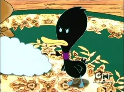 - “The Precious, Wonderful, Adorable, Loveable Duckling” – When Eustace cracks open an egg to cook for breakfast, a little duckling pops out and instantly claims the farmer as his mother. It soon becomes clear, however, that the sweet little duckling wants Eustace all to himself and is plotting to get rid of Muriel and Courage. Outside the farm, Courage comes across a nest of eggs and finds all but one egg hatched. Courage decides to give the unhatched egg a nice, warm home and takes it with him. As soon as he gets inside the house to nourish it, Eustace snatches it from him and uses it for his breakfast. He puts a pan on the stove, melts the butter in it, and cracks open the egg, only for a black duckling to fall out and onto the hot pan, causing it to hop out and onto Eustace’s face. The farmer slams the duckling on the ground and accuses Courage of trying to poison him. The duckling pulls out a boot from nowhere and whacks Courage in the leg with it. The duckling turns to Eustace and hugs him, believing that the farmer is his mother. (Of all the people in that house to choose as a mother…. this duckling picks the worst one. Muriel offers Eustace a blanket while he sleeps in his chair and relaxes in her rocking chair. Courage comes in and catches the duckling trying to saw the leg of Muriel’s rocking chair. Courage merely stops him and snatches the saw from him. The duckling calls “Mama!” and Eustace wakes up all of a sudden. Courage tries to explain to Eustace what happened, but as usual, the farmer promptly tosses the dog outside. A furious Courage manages to make it back inside just in time to catch the duckling dumping a bag of dry cement in Muriel’s bath water while she is taking a bath inside the bathroom. Courage stops him and once again, the duckling calls “Mama!” and Eustace appears inside the bathroom, accusing Courage. Muriel wakes up from her bath and runs out of the bathroom. The duckling, upset that his plan to get rid of Muriel has failed again thanks to Courage, promptly tosses the dog into the bath water of wet cement. While Eustace is sitting in his armchair listening to music, Muriel is strapped to a rocket ship about to fly to outer space by the duckling inside the attic. The duckling finishes screwing the ship and closes the hood, only to get his wing caught in it. Courage makes it inside the attic and frees Muriel out of the rocket. With no way to get his wing out of the hood latch, the duckling calls “Mama!”, which Eustace is able to hear through his headphones. Courage attempts to free him out of the hood latch. Eustace enters the attic and grabs him, only for the ship to fire off to space after the countdown. As the rocket lands onto the moon, the duckling is seen giving Eustace a foot massage, saying “This didn’t work out so badly after all, did it?”