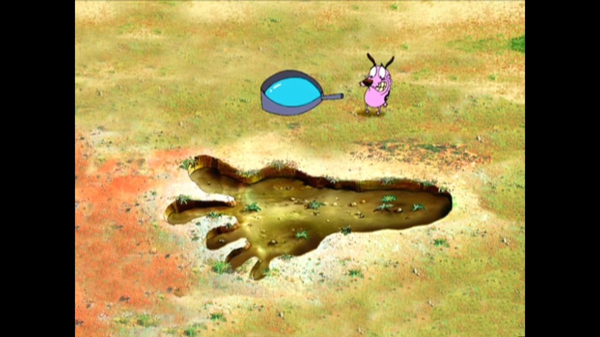 - “Courage Meets Bigfoot” – This was a cute episode… Things are not always what they seem. Everything that seems scary is not. My niece thought it was funny. Good times. Muriel and Eustace are in the living room watching TV. Courage is in the kitchen having a bedtime snack when he hears a noise outside. He stares at the window and discovers a mysterious creature outside. He warns his owners and Muriel takes a look outside to find trash everywhere. She tells Courage that it was only raccoons. But Courage is not the least bit convinced. (What I also thought was funny… was how the old couple was always in danger…. but even when given a warning by Courage who is never wrong…. they always brush it off.) While Eustace and Muriel are asleep, Courage stares at the window to discover the mysterious creature again and runs downstairs to the kitchen to find that the creature is attempting to snatch the pie from the windowsill. Courage makes a grab for it and ends up with it all over his face. Muriel wakes up to this and tells Courage that it’s okay and that she’ll make another one tomorrow right before telling him to use a plate next time. The next morning, the Newsman on TV informs that a Bigfoot is on the loose and that a reward is offered if he is found, much to Eustace’s delight. Courage is convinced that it was probably Bigfoot that was at the house last night. He goes outside to find evidence and comes across a massive footprint. He warns Eustace, who is prepared to catch Bigfoot, about this, but to no avail. Suddenly, a knock on the door is heard and an old lady is there looking for her lost boy, to which Eustace responds that he hasn’t seen him right before slamming the door shut. When Muriel invites Courage in the kitchen for dessert, the latter finds Bigfoot by surprise and starts a food fight with the creature. The two then end up dancing together and are interrupted by Eustace, who is scared off by Bigfoot. Courage continues to dance with the creature, but their dance is interrupted again when Bigfoot is hit with a stone thrown through the window. Courage and Bigfoot look outside to find an rather large angry mob ready to take Bigfoot down. Courage tries to convince the mob of the creature’s true nature, but to no avail. The mob are ready to attack (as well as Eustace) and they are interrupted by the old lady that was there earlier. It turns out that Bigfoot was her “lost boy” she was looking for and she is reunited with him. It is also revealed that Bigfoot is named Theodore. The crowd is touched by the display, realizing Bigfoot is not an evil monster. However, the greedy Eustace is not the least bit stirred by this and locks the ankle bracelet on Bigfoot’s ankle, eager for his reward. He is hit on the head with a rolling pin by Muriel, who demands him to remove the ankle bracelet off Bigfoot’s ankle, which the stubborn farmer refuses, and as a result, the mob turns on him and chases him away.