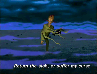 - “King Ramses’ Curse” – We love this one in the Twitterverse. In the dead of the night, after stealing an Egyptian stone slab from the tomb of King Ramses, two feline grave robbers are fleeing from the scene of the crime in their car. Pursued by the police, the duo decides that the best course of action is to hide the slab, and return to its location once the authorities have given up the chase in order to retrieve it (for the sake of concealing any incriminating evidence). They pull over to bury the slab at the nearest landmark in sight, which is the Bagge’s water-pump. As they re-enter their vehicle in order to escape, they are confronted by King Ramses himself, who demands that his slab be returned lest the thieves suffer his curse. The confused thieves, unaware of the curse, do not have a chance to react before they are surrounded by a swarm of locusts, which quickly devour both them and the car. Courage unearths the slab the next day. The slab contains symbols of Ramses, water, a record player, and locusts. Courage shows it to his owners, but Eustace dismisses the slab as “garbage” and tosses it out the window. But when the story on Nowhere News runs about the slab being worth one million dollars… he starts singing a different tune. Courage notices that the first symbol, the Ramses, disappears from the slab and wails in dismay. Eustace contacts the Nowhere Newspaper to place an ad for the slab, despite Muriel’s condemnation of his behavior. Professor Frith arrives and tries to reclaim the slab, but Eustace refuses to give it up for free. That night, the ghost of Ramses returns, and this time threatens the Bagges. He orders Eustace to return the slab or he would be visited by three “plagues”, each worse than the last. Eustace, believing that the ghost is the professor in disguise, asks “What’s your offer?” (I used to wonder what he needed to spend money on… but whatevs.) The ghost unleashes the first plague. The second representative symbol on the slab, the water, disappears, and the house subsequently begins to fill up with water. While Muriel is drowning, Eustace uses his snorkel gear. Courage swims to the basement and pulls a drain stopper and all the water drains out from the house thus defeating the first plague much to the ghost’s annoyance. Unfazed by the ordeal, Eustace again refuses the ghost’s request asking for an offer, initiating the second plague. Again, the representative symbol on the stone slab, the record player, disappears. A skipping record that repeatedly blares “King Ramses, the man in gauze,” permeates the air, causing the family audible pain. Eustace alleviates the noise by plugging his ears using cotton, but leaves Muriel suffering. (I used to wonder why Muriel remained with Eustace… he is not great and especially not great to her.) Courage finds the source of the noise behind a boulder, destroying the phonograph with a baseball bat to stop the racket. King Ramses once again demands the return of his slab. Muriel insists that Eustace return the slab, but Eustace still refuses to do so without getting paid. The ghost then unleashes his third and final plague: the locusts. The final symbol disappears from the slab, and the insects begin to devour the house starting from the roof. As the house is devoured by the locusts, Muriel prepares food as a stress relief tactic. Courage and Eustace wrestle over the slab. Eustace finally gives in once he realizes how close they are to being devoured, allowing Courage to toss the artifact toward Ramses, which ends the curse. However, Eustace reclaims the slab after the locusts had left and taunts Ramses, thinking that he, since he used three different plagues, is now powerless. Annoyed, Ramses simply reuses the third plague by summoning the locusts again, and Eustace is devoured. (Talk about not feeling a damn thing. I usually care not about what happens to Eustace.)