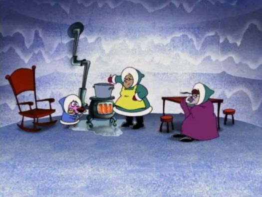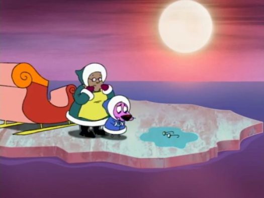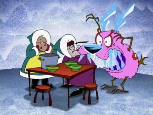 - “The Snowman Cometh” – Who vacations in the artic? Not me. Courage, Eustace, and Muriel go to the Arctic for a vacation and find themselves on the freezing tundra in an igloo. While Muriel attempts to make soup, Courage goes out to get firewood, and finds a Snowman out in the middle of the barren land. Knowing he didn’t make it himself, he wonders how it got there. Nevertheless, the snowman has two sticks for arms and when Courage takes one for firewood, the snowman comes to life and demands for Courage to give it back. Courage does and runs back to the igloo screaming. He warns his owners about the snowman, but they dismiss it as usual. . Courage sees the snowman again outside the window and tries to tell his owners. When Eustace and Muriel go outside to investigate, they find nothing. Courage finds the snowman’s tracks and follows them reluctantly. He arrives at a snow cave where he overhears the snowman’s plans. The snowman is the last of its kind. He is determined not to fall victim to heat as his friends had done. The only way to keep from melting is to extract an anti-melting gene from a human and he plans to do so on Eustace and Muriel. Courage runs back to the igloo, but falls into a pond on the way and freezes. He manages to escape, but due to his problems, the snowman has already beaten him to the igloo and taken Muriel and Eustace. Courage finds a sled and races back to the cave to save his owners. (They really need to pay him for his protection.) the snowman traps Courage and extracts the gene from Eustace. Before he can do the same to Muriel, Courage escapes and slams a glass pitcher down on the snowman’s head. With the snowman distracted trying to pull the pitcher off of his head, Courage, Muriel and Eustace escapes and hop into the sled. They sled down a hill, with the snowman in hot pursuit, onto a frozen lake and are trapped with the snowman not far behind. Courage quickly begins chopping at the ice, and it manages to break, sending the snowman into the water, and Courage, Muriel and Eustace safely float away on a chunk of ice. But due to the gene being extracted from him, Eustace melts into a puddle right as a ship appears to save the trio. At home, Muriel and Courage go back to the same-old, same old, but Eustace is now in liquid form in a glass pitcher.