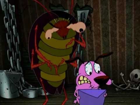 - “Courage in the Big Stinkin’ City” – The Bagge Family arrives in New York City, as Muriel has won a sitar contest and her prize is to perform at Radio City Music Hall. At the theatre, the family is welcomed by a giant cockroach who calls himself Schwick. his real name is Buschwick, where he’s from, but not under any circumstance may anyone call him that. He poses as a stage hand and promises Muriel her own rehearsal room and Eustace hot dogs. Schwick shows them to the “rehearsal room,” a scary, musty room littered with shackles and human remains. There is an unseen threat living in a mouse hole in the room that is responsible for the demise of previous of the theatre’s stars. The argumentative Schwick sends Courage out to get a package and orders him to hurry up and to keep the police out of the picture, otherwise “It’s curtains for the sitar lady.” Courage tries to find the house where the package is waiting, and eventually finds his way to the block of an condemned apartment. The building’s inhabited by several monsters and unseen residents behind sealed doors screaming to be released. After retrieving the package, Courage flees the scary abandoned apartment building and jumps on a subway train. A policeman, who is searching for the “evil” package, has followed Courage and asks him to show his license. The railroad engineer is so terrified by the sight of the evil package, he flees the train. Courage tries to take control, but unfortunately steers the train into the theatre’s rehearsal room, where Muriel is still practicing. Schwick takes the evil package, which contains nothing more than a window squeegee that Schwick needs to wipe away the cry for help written on the grimy window. However, the train collision has broken the squeegee. The bug is infuriated, yells “Nobody double-crosses Schwick!” and now opts to unleash the rehearsal room monster. Courage panics and carries Muriel as Schwick chases them; They run up through the crashed train. They eventually make it up to the Radio City stage, where Muriel performs. The police officer from the train has called for backup, disguised as dancing women in the performance, and Schwick is kicked into a trombone. Schwick turns out to be a wanted fugitive and not a real stage hand, and gets arrested. Muriel finishes her masterpiece to massive applause, and Eustace, having been eaten and reduced to nothing but a skeleton by the unseen monster, is seen watching his wife on TV in the rehearsal room, while complaining about the channels.
