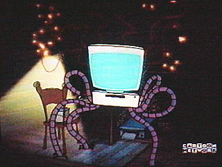 - “Mega Muriel the Magnificent” – The Computer scoffs at Courage’s memoirs that he is writing, calling all living creatures timid and cowardly. During a thunderstorm, lightning strikes The Computer, causing it to come to life. After a short-lived attempt at invading Eustace’s body, it takes over Muriel’s and does death-defying stunts in it, under the moniker of “Mega Muriel the Magnificent,” in order to show how courageous it is. Courage must stop it, or Muriel’s body could be severely harmed if he doesn’t. Courage’s memoirs are retellings of the episodes “The Snowman Cometh”, “Freaky Fred”, and “Queen of the Black Puddle”. Mega Muriel the Magnificent’s death-defying stunts were: 1.Being shot out of a cannon and shot through the moon to Mars. 2. Diving into the San Andreas Fault during an earthquake. 3. Skiing down the side of the Empire State Building and into a sewer.