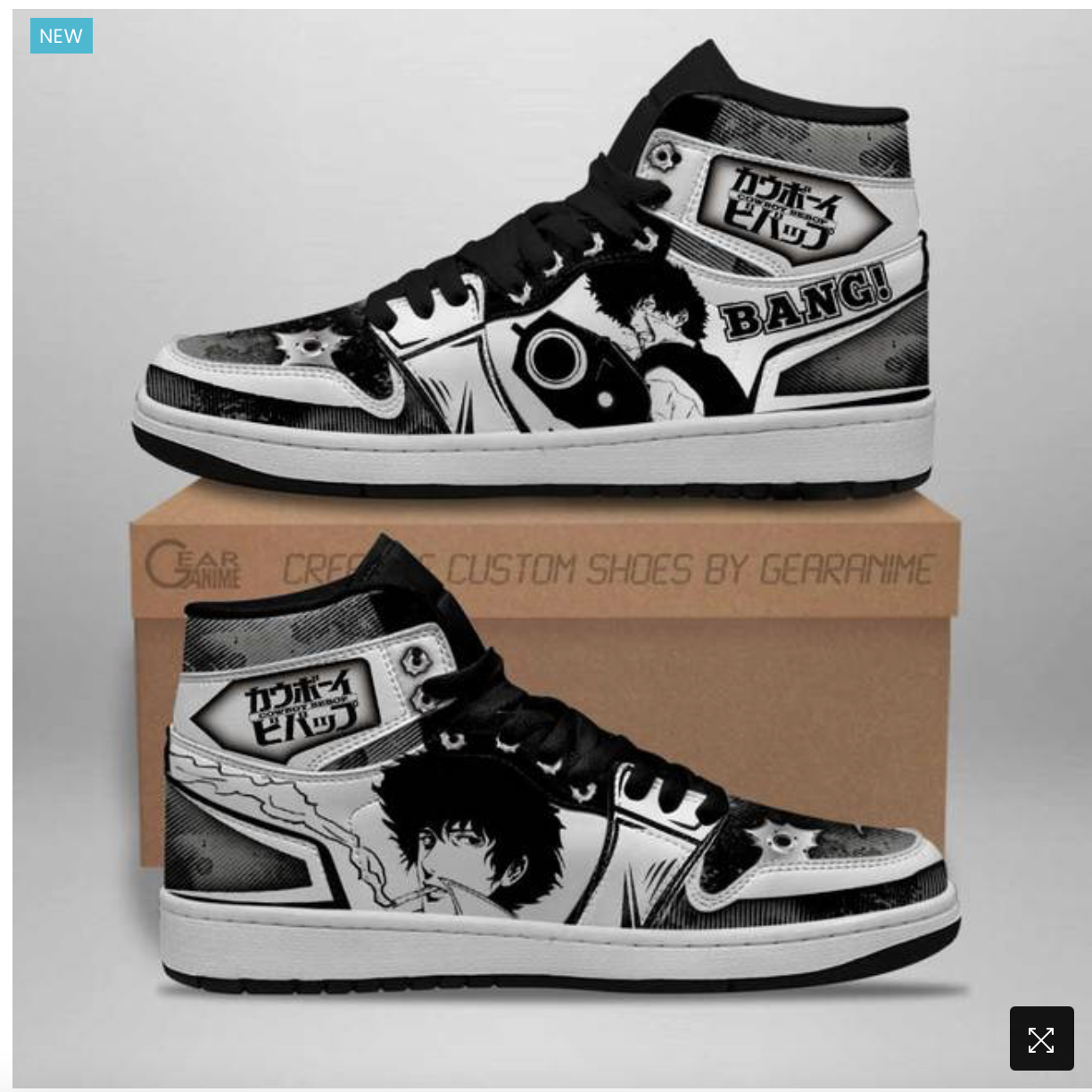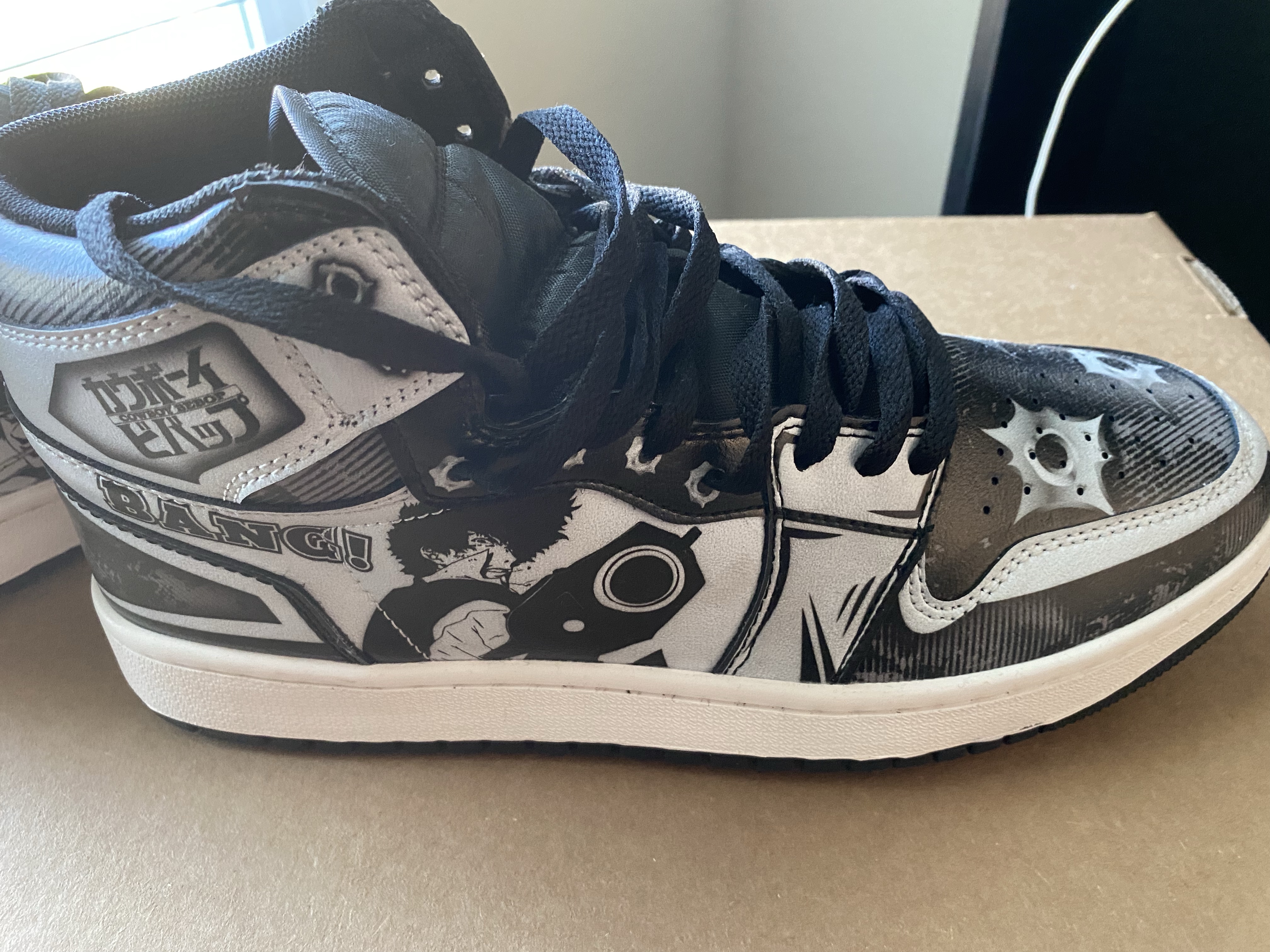 - Cowboy Bebop Sneakers Spike Spiegel Anime Custom Shoes – Who (if you have seen Cowboy Bebop… and don’t start with me… I have met plenty of people who haven’t) doesn’t love Spike… I wanted to hop on this because it was a new release. I enjoyed the simple design. This was more to my liking/personality. I enjoy black and white. Although the last haul was me branching out of that box. But this was so me.