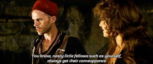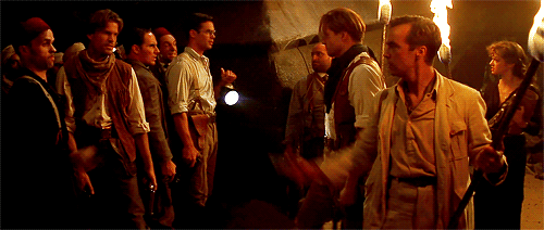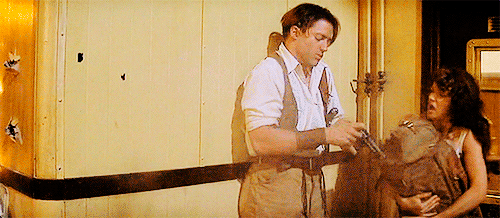 - River Boat fire anyone…. Even though this is a serious action/adventure scene… the humor here is too much. Rick and Jonathan… Rick and Beni… Rick and Evie… There is a lot to love here. Once on the riverboat, O’Connell and his group meet other men seeking Hamunaptra: three American treasure hunters and their professorial consultant. The Americans make a wager with O’Connell that they would reach the City of the Dead first, which O’Connell sportingly accepts. They claim that they are so confident because they have a guide that had actually been there. (You can tell that Rick thinks that Jonathan talks too much. Rick doesn’t want the Americans to know anything about him or their trip.) Later that night, O’Connell tells Evie of his experience in the ruins, and that he comes armed because something resides in those ruins: evil. Evie, however, does not believe in curses and dismisses the notion of evil lying beneath the sands, hoping instead to find an ancient artifact known as the Book of Amun-Ra; eventually Evie leaves in a huff, leaving O’Connell alone until he meets up with Beni Gabor, whose actions of cowering in the ruins had almost gotten O’Connell killed. Beni reveals that he is leading the Americans to Hamunaptra, but asks why O’Connell, who had never believed in Hamunaptra, is returning. When O’Connell reveals that it is because Evie had saved his life, Beni sarcastically jokes about it: O’Connell not appreciating the humor and subsequently tossing Beni overboard. That night, a number of Medjai come aboard looking for the puzzle box and the map that Evie owns. One Medjai snuck into Evie’s room and holds her at the point of a blade. O’Connell bursts in guns… blazing and sets the room and the subsequently the boat on fire. O’Connell quickly shoots off many of the men, joined by the three Americans, but the Medjai have caused too much damage to the riverboat to remain aboard, compelling O’Connell and all others aboard to jump ship and swim to shore. The passengers all reach the riverbanks safely, but Beni and his employers succeed in obtaining the horses and camels from the boat, leaving O’Connell and his fellows to purchase their own rides at a Bedouin trading post the next morning. I spent a lot of time laughing at Rick and Evie’s interactions in this scene…. First when she storms off… throwing Beni off the boat… and Evie keeping Rick from getting his head blown off. Rick: “Can you swim?!” Evie: “well… yes… if the occasion calls for it!” Rick: Trust me! The occasion calls for it.” Watch the scene here: https://www.youtube.com/watch?v=dZBkTm19fmM