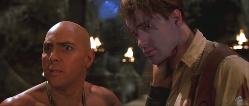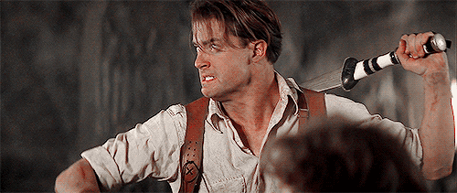 - Cut to the jail… Evie learning that Jonathan lied about where he got the artifact. “You lied to me!” “I lie to everyone. What makes you so special?” “I’m your sister!” “Yes, well that only makes you more gullible.” They end up at Cairo Prison. Rick has been taken in under the charge of deserting his post in the French Foreign Legion. He is visited by Evie and Jonathan, who had come to ask about the small puzzle-box that O’Connell found while at Hamunaptra. O’Connell eyes Evie with some interest, and divulged the story of how he had found the box: he had been at the city when he found it. Since Jonathan is the man that picked his pocket and stole the puzzle-box from him, Jonathan was thus punched hard in the face by O’Connell… he deserved that. The great thing about the scene… that Evie just steps over her brother to find out if Rick will tell her how to get to Hamunaptra. Rick kisses her and tells her to get him out of there. At that moment, the guards in the cell seized the American and beat him, taking him away as they did. The warden stepped on the scene and revealed to Evie and her brother that the guards were taking him away to be hanged. Evie attends the hanging, despite the warden’s disapproval, and tries to barter for O’Connell’s freedom as the guards tied the ropes around O’Connell’s neck. I always laugh when the hangman asks if O’Connell has any last requests. When O’Connell responds that he wants to be let go… there is a bit of shock and turns to make sure that he should fulfill that request. Evie has to have a back and forth with the Warden to get O’Connell out… She has to reveal that he knows that location to Hamunaptra. Meanwhile… Rick is dropped from the scaffold… and now he is strangling to death. However, the warden was soon coaxed to release O’Connell as he was offered twenty-five percent of the profits made from the ruins’ discovery. The warden has poor negotiating skills. I watch this scene differently… knowing that Fraser almost choked to death. Poor Guy. Watch the scene here: https://www.youtube.com/watch?v=NW2QM6c1wAI