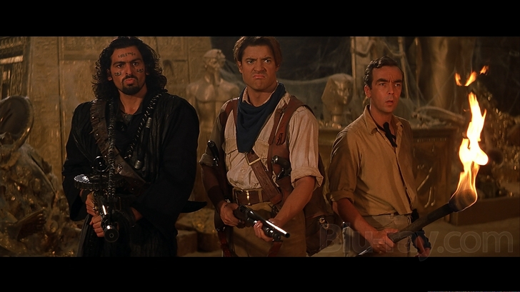 - Ardeth, Jonathan, and O’Connell make to Hamunaptra and try to pry their way into the tunnels. Well mostly, Ardeth and O’Connell doing the hard work…. Jonathan is standing around barking orders… It makes a normal person want to punch him. On top of that…he starts playing with the scarab beetle. O’Connell (and Ardeth) have to stop what they are doing to cut out the bug and kill it giving away their position to the Imhotep. Jonathan can be funny but sometimes he is annoying. Imhotep hears the gunshot echo from the halls, knowing that O’Connell and his friends have survived. (Thanks Jonathan.) Imhotep reaches into the broken canopic jar that once had held Anck-Su-Namun’s heart and pulls out the organ, holding it in his hand before crushing it to dust and blowing it against a stone mural of two priests. Muttering an incantation, Imhotep brings the stone priests to life; the priests in the mural are two of his priests from ancient times who had been mummified alive by being encased within the walls. Imhotep gives them the order to kill O’Connell and awaken the other priests. The priests converge on our 3 guys but the guys are more than prepared. The three men take out their guns and begin to blast the mummies away, heading to the statue of Horus so as to find the Golden Book. Once O’Connell, Jonathan and Ardeth reach the statue of Horus, O’Connell and Jonathan begin to try and pry its compartment open as Ardeth provides cover fire. Once the compartment is opened, the Golden Book is extracted and Ardeth tells O’Connell and Jonathan to save Evelyn and kill the mummy off, leading the mummies away as he runs through a corridor, blasting as many as he can. O’Connell then lights a stick of dynamite and throws it into a dead end, blowing a hole through the wall and killing off more mummies: O’Connell and Jonathan then make their way through the hole and into the sacrificial chamber. I think my favorite thing about this scene… has to be when the priests appear and both Beni and Evie are startled by what they see. These two end up fighting with each other in the background while Imhotep gives instructions. The other funny thing….. O’Connell strikes the match on Ardeth Bey’s beard.