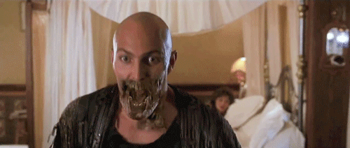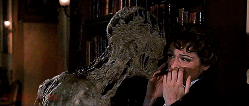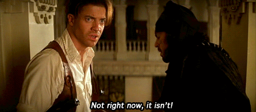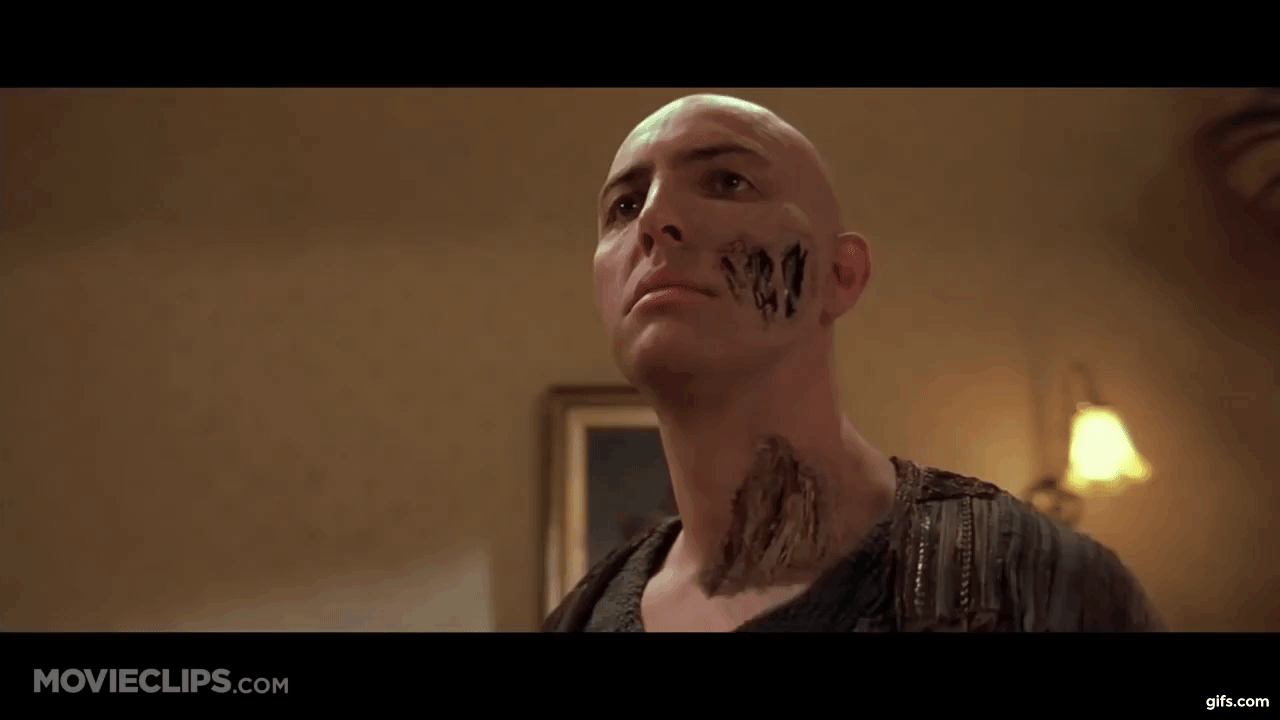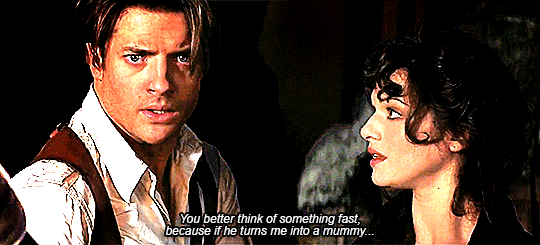 - Cut to her reading from the damn book. No harm came from reading from a damn book. Right? (GIRL WHAT ARE YOU DOING??? WHY? STOP THIS!!??? Later, when everyone is asleep, Evie steals the Book of the Dead from the Egyptologist’s grip (in true Jonathan or Rick fashion) and uses the key to open the locks. Evie then opens the Book and begins to read the words aloud, not knowing that the mummy found below in the chambers is awakening. Dr. Chamberlain awakes screaming at Evie to not read from the Book, but the damage has been done. A swarm of locusts flies out over the horizon, engulfing the camp and its residents entirely. The expeditions are separated: the three Americans run down the corridors with a number of their diggers, but Burns, one of the three Americans, trips and falls, losing his glasses, which are crushed by Beni as he attempts to reach the others. Unable to see where he is, Burns stumbles about the corridors blindly, seeing a fuzzy-looking figure at the end of the corridor, but unable to see who it is. The figure sneaks up from behind him and attacks Burns as he screams in terror. O’Connell, Evie and Jonathan run through one corridor trying to escape the man-eating scarab swarms. Evie is separated from the others and falls through a trapdoor in the wall and finds herself in a dark chamber where she sees Burns, his back turned to her. When she tries to talk to Burns and possibly get her to protect him… Burns turns around to reveal that his eyes and tongue have been torn out. (That shook young me.) Evie is caught by the mummy… (the same one that her and the guys found.) The mummy has Burn’s eyes and tongue. Imhotep. The mummy walks towards her, believing her to be Anck-Su-Namun, and roars in anger when approached by O’Connell, Jonathan and the two Americans. O’Connell roars back in mock gesture and blasts Imhotep in two with his elephant gun, allowing the others to escape. The Medjai arrive and give Burns back to the Americans. Though at first Rick believes the Medjai to be responsible, the Medjai explain that they had in fact rescued Burns and he was lucky to survive before the creature could finish his work. Commanding them all to leave, Ardeth declared that his fellow warriors will go on the hunt and try to find the means to kill the mummy. Imhotep is walking plague upon all the earth. Ardeth Bay, explains that because they did not leave, they have brought forth an ancient suppressed evil that has been feared by the Medjai for over three thousand years, and Ardeth Bay informs O’Connell, who had shot the mummy, that mortal weapons cannot kill the creature as he is not of the mortal world. (I think it probably would have been effective if the medjai just explained why they shouldn’t be here.) Beni, on the other hand, who has been separated from the rest of the group, wanders the catacombs and finds himself face to face with the mummy; Beni tries to plead for his life with religious icons from different beliefs, but only the Star of David, the Hebrew symbol, appeals to Imhotep, who knows that it is the symbol of the former slaves. Imhotep declares that he has use for Beni, and that in exchange for his servitude, he would be rewarded greatly. (When Beni pulled out all the chains, I was floored… it was also the glaring indication to me that he was not going to make it. He had no real principles or morals…) Check out the scene here: https://www.youtube.com/watch?v=4dyWUrXZG_w and https://www.youtube.com/watch?v=pDWR5RkWRTY