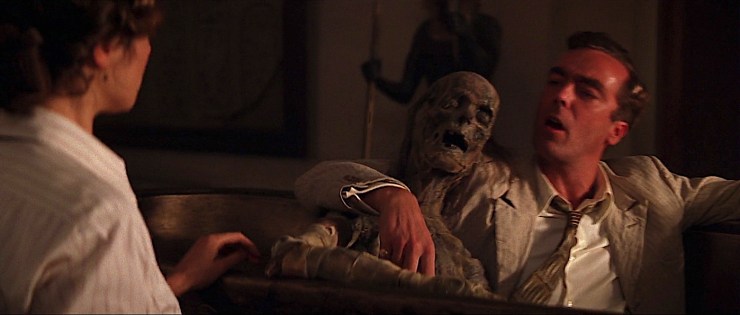 - Now that the Egyptologist has been taken out… that leaves Henderson and Daniels. Daniels’ unease grows with having to guard the door and leaves to get a drink. Henderson proceeds to watch the door alone when the window opens with a blast of wind and sand, at which point Henderson is lifted up in the sandy cloud and sucked devoid of organs. The sand settles and Imhotep, almost entirely regenerated, strides toward the door, passing the corpse of Henderson. Imhotep enters the locked room by taking the form of sand and slipping through the keyhole, coming up on the other side to find Evie sleeping. Imhotep softly utters “Anck-Su-Namun”, shuts his eyes and kisses her, indifferent to her waking up screaming as his face starts to decay. What is the thing about Evie being kissed against her will? O’Connell and Jonathan burst in, O’Connell yelling at Imhotep to get away from Evie; Imhotep hisses a retort in ancient Egyptian and O’Connell picks up Cleo, Evie’s cat, brandishing her at Imhotep, who roars in fear and blasts his way out the window. Obviously, the plan to protect everyone is not working and going down the tube pretty quickly. Check out the scene here: https://www.youtube.com/watch?v=K58cPYCTiPM