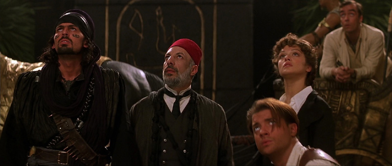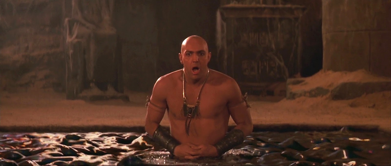 - What is Beni doing during the search for the the Golden Book? Looting as much treasures as he can, loading a satchel of the pilfered gold and jewels onto the camels of the legionnaires that still linger about the ruins. The gold that he has collected, however, does not seem enough, so Beni returns inside, taking more treasures out. See? He could have rode off into the sunset…. but he never seemed that bright… so there you have it. Imhotep, having chained Evelyn to a sacrificial altar, begins to perform the incantations that would bring Anck-Su-Namun back, almost stabbing Evelyn fatally before Jonathan intervenes. While Jonathan stands at the height of a staircase brandishing the Book of Amun-Ra, (so much for the art of surprise…. but one could argue that was lost a while ago.) O’Connell sneaks into the chamber, takes a golden sword from a nearby statue, and begins take down the mummy priests, cutting Evelyn’s chains as he does. Jonathan then mistakenly summons up even more of the mummies, all sporting soldier garb and spears, compelling O’Connell to duel more of them. Dueling them on, O’Connell manages to destroy more as he runs down the stairs of the sacrificial chamber, decapitating two and burning one up until they finally outnumber and overpower him at the point of their spears, sickles and blades. Before they can bring down their attacks, however, the mummies are stopped by Jonathan, who reads the final incantations for the spell that summoned the mummies up, stopping them from harming O’Connell. Removing their blades from his face, the mummies stand motionless until Jonathan gives them the order to kill Anck-Su-Namun, which they carry out at once, despite Imhotep ordering them to kill O’Connell. Gotta love Evie screaming at her brother to finish the incantation so he can control the mummies. Also the way Jonathan just drops the book when Imhotep comes after him. He tries to get the book, but he is too late to save Anck-Su-Namun, who is hacked to death by the mummified guards. In anger, Imhotep lunges forward to strangle Jonathan, but O’Connell leaps forward and chops off the mummy’s arm, which holds onto Jonathan’s neck, the arm’s rotted sinews reveal that below his human appearance, the mummy is still a dead man inside. (Gross…. but not unexpected. And he even grabs the arm and reattaches it.) Jonathan searches through Imhoteps robes (left behind after his arm was cut off.) and takes the puzzle box needed to open the Book of Amun-Ra, using it to open the Book as Evelyn reads through it, looking for the spell that would stop Imhotep. Imhotep throws O’Connell against statues and the floor until he seizes O’Connell up by his throat, strangling him, and prepares to deliver his final attack, unhinging his jaw. Evelyn, however, reads aloud the incantations to stop Imhotep, summoning the god Anubis, who rides into the chamber on his chariot and drives through Imhotep, taking away his immortality. Anubis has not, however, killed Imhotep, and Imhotep moves forward furiously towards O’Connell, intending to kill him, but O’Connell is ready with his sword, impales the priest as he lunges forward. Evelyn reveals that Imhotep is mortal, and the mummy steps back dying into a moat, dying while numerous souls engulf him, reducing him to a mummy once more as he utters his final words: “Death is only the beginning.”