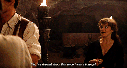 - The race to the ruins is hilarious. Rick’s team has purchased camels since Beni’s group has all the horses. Traveling through the night… they wait for the sun rise to be “shown the way.” (It was the sleeping while riding the camel. I would never be able to do that. NEVER. I would be face down in the sand.) Then they resume their journey, each group racing against the other to reach the city first. The group consisting of Evie, O’Connell, Jonathan, and the Warden win the race, reaching the ruins before the others do. Beni processed to try and thrash O’Connell but O’Connell gets the best of him and throws him off the horse. (It makes me laugh every time.) Once camp is being set up, the Americans take the best areas to search for treasures to themselves, as the smaller group searches for openings to the chambers below. The funniest thing about this was… Rick trying to impress Evie with a kit he stole from the Americans. Watch the scene here: https://www.youtube.com/watch?v=iBTmNvvdpic The stuttering… the glances and then the “What are you looking at?!” to the warden. Too Funny. Also have to enjoy the misogyny from the Egyptologist. Making their way to the underground chambers, the group headed by O’Connell searches through the tunnels for any areas in which to dig and find treasures. Reaching the base of the statue of Anubis, the four treasure hunters begin to hear strange sounds coming from around the statue; guns out in the open, they turn around to face the source of the sounds, coming instead face-to-face with the rival group, also armed. With both groups meeting in the same area, the argument over the right to dig at the statue base begins, ending with the Americans and their diggers winning the statue base; as Evie notices quietly that there is another chamber below, she surrenders the chamber to the larger group.