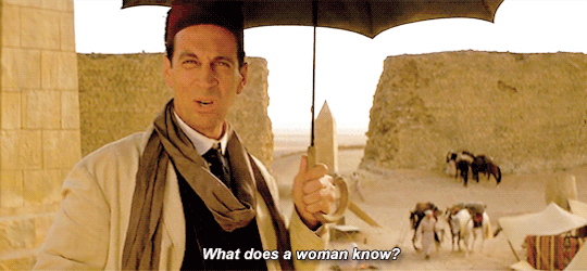 - Evie says that she is going to the only man she knows who will have the answers…. I should have known it would be her boss… The survivors (O’Connell, Evie, Jonathan, Daniels and Henderson) all head to the Cairo Museum, seeking the help of Dr. Bey. They found Dr. Bey in the company of the chieftain of the Medjai himself, Ardeth Bay… The three Americans and Jonathan point their pistols in their direction as Evie asks what the Medjai is doing there, to which Dr. Bey calmly asks them to lower their pistols so that they might explain. The curator goes on to explain that the Medjai are an ancient society that devoted itself to the protection of mankind for the past three thousand years, guarding the city of Hamunaptra from thieves and those that might activate the curse of the mummy, a goal which, thanks to Evie, has been brought to ruin. Evie is appalled that they are justifying killing of innocent people…. (Innocent…?) Dr. Bey explains that Imhotep, in his undead form, fears cats because they are the guardians of the Underworld and will fear them until he regenerates, at which point he will fear nothing, Daniels and Henderson being especially fearful of how the mummy regenerates. Evie notes that while the group was in Hamunaptra, the mummy called her “Anck-Su-Namun” and while they were in Burns’ quarters, he attempted to kiss her: Dr. Bey notes that Imhotep was cursed for his love of Anck-Su-Namun and that even after three thousand years he is still in love with her, (now…. that is love.) intending to bring her back from the dead and use Evie as the sacrificial victim needed. As Jonathan remarks that it’s bad luck, Dr. Bey states that it might give them the time needed to kill Imhotep, but Ardeth Bey looks up through the museum skylight to see that the sun is being blocked out, a sign that the mummy’s powers are growing. I enjoy that the Medjai called out our “heroes.” You started this mess. Later, at the residence where the survivors are staying, Evie asks who was present when the chest was opened: Burns, Henderson, Daniels and the Egyptologist, Dr. Chamberlain; Beni ran in fear before they could open the chest. Evie notes that they must rescue the Egyptologist and bring him back to Fort Brydon before the mummy can reach him.