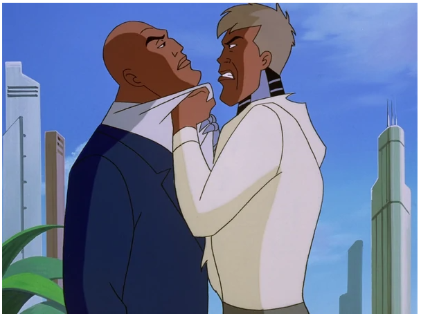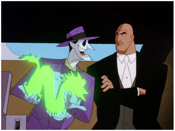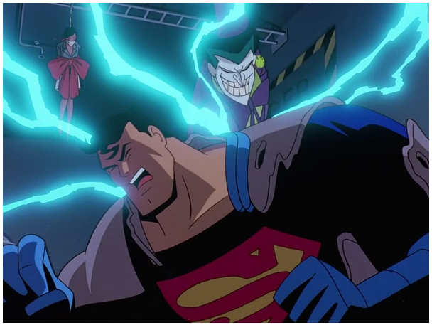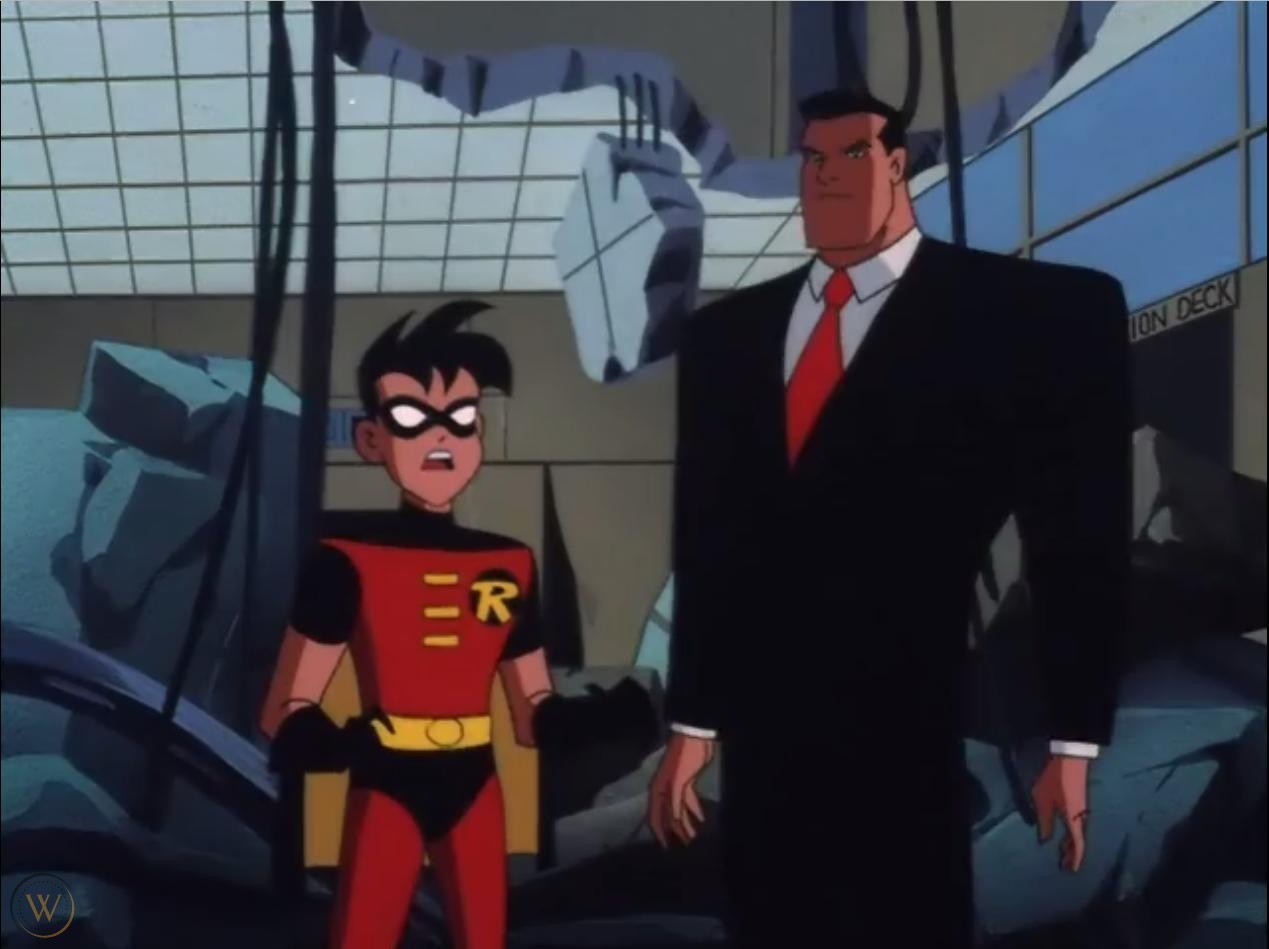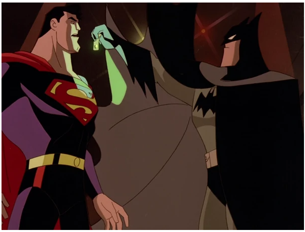 - World’s Finest (Season 2, Episodes 16, 17 and 18) – Anytime the DCAU delivers a 3 part episode… you know it is going to be EPIC… The episode depicts the first meeting of Batman and Superman in the DCAU, when Batman comes to Metropolis in pursuit of the Joker, who has offered to kill Superman for Lex Luthor. Superman finds himself out of his depth when matched against the Joker’s cunning and unpredictability, while Batman has trouble with the resources Luthor provides the Joker with. Both heroes must agree to overcome their differences in order to put a stop to the Joker and Luthor. The DCAU since released the 3 parts as a full Length film. So…. hold on to your butts… this will be a long one. Part 1 opens up with Joker and Harley Quinn stealing a green dragon statue from an antique shop. (Gotta love his use of the Joker venom. I used to have nightmares about that ghastly laugh and smile.) Later, the police investigate the crime scene and wonder why Joker would only take one jade statue, worth maybe a hundred thousand dollars, especially when rumor has it that he’s short on funds. Batman examines a fragment of the statue that had been left behind and takes it for further study. Back in the Batcave, he runs test on the sample, while Alfred reports that the “Laughing Dragon” has gained a bad reputation for being cursed, since all of its owners died prematurely. Batman knows why: the “jade” is emitting low-level radiation, meaning it’s actually Kryptonite. Now realizing what the Joker is up to, Batman heads off to Metropolis, where, incidentally, Bruce Wayne has business to attend. Out over Metropolis, terrorists seize control of Air Force One, with the President of the United States on board. Lois Lane is among the press corps on board, virtually guaranteeing Superman’s prompt arrival. He easily defeats the terrorists and saves the passengers. Lex Luthor sourly reads about the President thanking Superman (How can you be sour about people being saved? I told you guys that he is trash.) and calls Mercy to get his car ready. Suddenly, she is knocked out by a mechanical Boxing Glove. Luthor enters the car and orders Mercy to take him to the office. However, the driver is revealed to be not Mercy, but Harley Quinn. Luthor then attempts to escape, but Harley locks the car and speeds off, driving quite recklessly. She then notices “a cute hitchhiker” on the edge of the street, which is the Joker lifting his pants leg. She brakes to a halt and the Joker enters the car, explaining to Luthor that he is broke, thanks to Batman’s success in closing down his operations in Gotham City. So he makes Luthor an offer: for one billion dollars, he’ll kill Superman. Luthor is initially skeptical as he wonders how the Joker has any chance at beating Superman when he can’t beat the less powerful Batman. He then changes his mind when the Joker shows him the Kryptonite statue. After the Joker assures him that it couldn’t be traced back to him, he accepts. (Now what kind of person aligns themselves with the Joker?) Later at the airport, a group of reporters, including Lois and Clark are awaiting the arrival of Bruce Wayne, who is revealed to be in Metropolis to oversee a cooperative venture between Wayne Enterprises and LexCorp. Lois reveals what she has heard of Bruce, believing him to be “Gotham Trash”. However, Lois is immediately taken with him when he steps off the plane. Bruce ignores Clark and instead helps Lois, revealing he was impressed with her adventure on Air Force One. Lois then asks him what brings him to Metropolis, however they are interrupted by Mercy who informs Bruce his car has arrived. Bruce then invites Lois over dinner to discuss the news and Lois happily accepts Bruce’s invitation, much to Clark’s displeasure. (They are not starting off on the best foot.) The next day, an insect-like probe droid, the Wayne/Lex T-7, crawls through a canyon even scaling walls. Bruce is pleased at how well his and Luthor’s companies have collaborated in developing the robots for space exploration. Luthor says the robots would be even more useful for military purposes, but Bruce, who under their agreement has sole control over the technology’s uses and more so with his hatred for guns, firmly squelches the idea. (Do I love when Luthor gets blocked? 1000%) Later on, Batman appears in a Metropolis nightclub, finding a runaway thug from the gang Joker recruited. While Batman is interrogating him, Superman arrives, saying he doesn’t want Batman’s brand of vigilantism in his town. To his astonishment, Batman throws him across the room with a judo move. Superman strikes back by ramming him into a wall, which allows the thug to escape. Using his x-ray vision, Superman peeks behind the mask and sees that Batman is Bruce Wayne, much to his annoyance. Superman expresses his disdain for Batman’s methods of vigilantism in Metropolis; Batman then pulls out the Kryptonite fragment and warns Superman of the Joker’s plan. Watch the scene here: (https://www.youtube.com/watch?v=hP-eMsjvYsE) Superman returns to his apartment. His jealousy increases when he gets a call from Lois, who says she’s taking the morning off to have breakfast with Bruce. As they talk, he notices a small, bat-themed homing device planted on his cape and picks it up. Clark goes to look out his window, as Lois hangs up. He uses his telescopic vision and spots Batman on the roof of a distant building, watching him through binoculars. Knowing Clark can see him, Batman smiles and with a boy scout salute, jumps down out of sight on the far side. Clark realizes Batman has now discovered his secret identity as well and crushes the device in anger. Part 2: Three days later, things are no better between Batman and Superman. Lois and Bruce flirt with each other at the Daily Planet, much to Clark’s chagrin. Out of her earshot they talk about Joker’s location, and Clark warns Bruce not to mistreat Lois, 