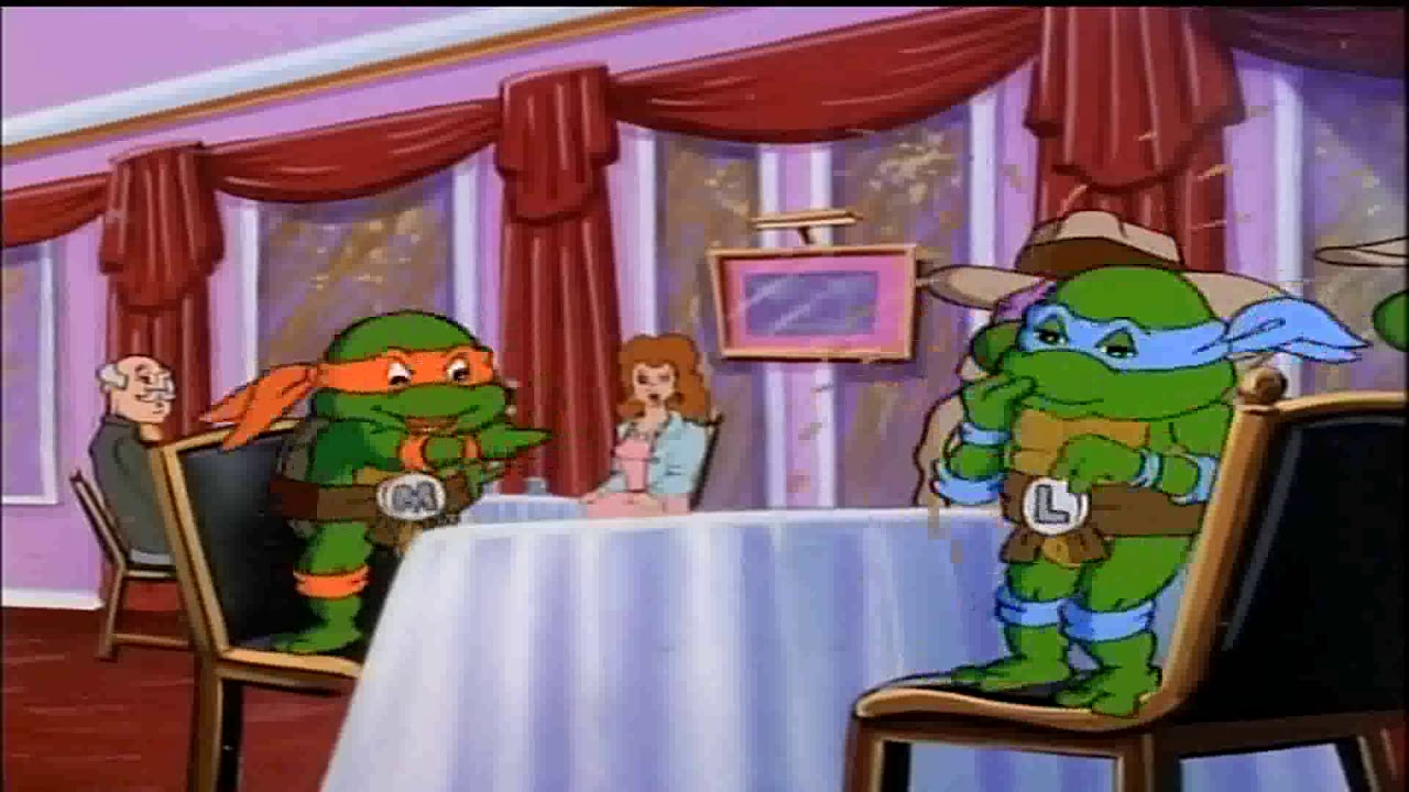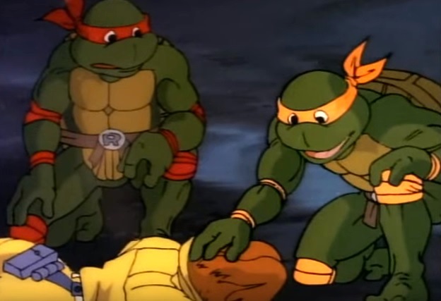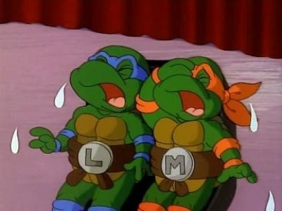 - Back to the Egg (Season 4, Episode 13) – After Michelangelo finds a special flyer for a pizza sale, the Turtles head out to buy dinner. On the Technodrome, Krang is displaying his latest invention: an age-reversing serum, which has the capability to de-age a living being into a helpless baby. He demonstrates this on a chicken; when the chicken eats the serum, it turns back into an egg. However, he doesn’t want Shredder to administer the serum to the Turtles. He is instead giving the task to Captain Krulik, an intergalactic circus ringmaster, who wants the infantilized Turtles for his show. Can you see where this is going? I could. Even 8 year old me… enjoyed my turtles more when they were teenagers. The Turtles arrive at Posh Pizza just before Krulik, Shredder and Kroolix’s tracker Grillox do. Krulik squirts the serum on the pizzas, but only manages to do two of them before Shredder “accidentally” causes him to spill the rest into a lobster tank. Leonardo and Michelangelo suddenly shrink down into small children, and begin throwing food at each other. As ordered by the waiter, Raphael and Donatello take their de-aged brothers back outside, where Krulik and Shredder attack them. The two pint-sized Turtles wander away from the fight and straight into traffic, only narrowly being saved by Donatello and Raphael, who act as their “parents” for the time being. It was a stressful time for me. At the lair, the children are placated with pizza and coloring books while Donatello tries to figure out what to do. But when left on their own, they hop on a Cheapskate and begin zipping around the streets, ending up where “Auntie April” works. The rambunctious kids accidentally destroy her computer and trash her office. Meanwhile, Donatello and Raphael find the leftover, thrown-out pizza slices that their brothers had been eating, in hopes of creating an antidote. But when they return to the lair they discover the other two are gone. April tells Donatello that she has the two child-sized Turtles, and agrees to look after them until Donatello can make an antidote. She places them in the audience of a children’s TV show, only for Shredder and Krulik to show up and attempt to kidnap them. Fortunately even small mutant turtles are still dangerous, and successfully deal with of the “bad guys.” Donatello successfully develops the age-reversal antidote and puts it on twin pizzas. Donatello and Raphael rush into the set and toss the antidote-laced pizzas up to Leonardo and Michelangelo. After some cajoling and even the usual parental promise of dessert if they behave (in this case, ice cream), they finally eat them, and turn back to their teenage selves. With all four Turtles now back at their correct sizes, the defeated villains flee the scene. It was pretty still as an adult. But it takes very little to entertain me.