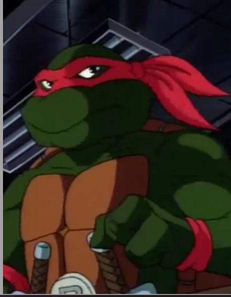 - Raphael: Turtle with the red bandana who wields two sais. He’s sarcastic, often jokes, and seems to get irritated easily. Voiced by Rob Paulsen, but in Vacation In Europe Side season, voiced by Hal Rayle, and voiced by Michael Gough in Season 10. Unlike later versions of Raphael, he is not a hothead, and is the main source of comic relief. He’s generally lazy and doesn’t want to fight at times all while remaining sarcastic. I maintain that I got my sarcasm from watching Raph work. Raphael gets along with the other turtles better than his later incarnations, but he sometimes can mock them or butt heads with them.