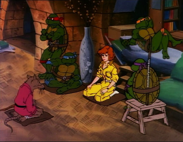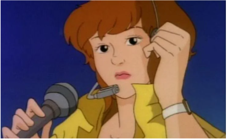 - April O’Neil: A red-headed Channel 6 TV reporter who discovers the Turtles’ home in the sewers. She befriended the Turtles in the very first episode. She is also known for wearing a yellow jumpsuit, except for the Red Sky episodes. April O’Neil was voiced by Renae Jacobs. This is the first version where April is a news reporter and it continued in other versions. She often puts her self in danger just to get her story and hardly had any love interests in the series. In the final two seasons, she became a freelance reporter.