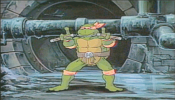 - Michelangelo: Turtle with the orange bandana, who wields two nunchuks but later wields a grappling hook. He is the most relaxed of the group, mostly interested with pizza and having a good time. He used a lot of slang, and is the source for many of the catch phrases such as “Cowabunga!”. He was voiced by Townsend Coleman in every episode. He is often teased by his brother Raphael in many episodes. He loves to skateboard, surf and party. Michelangelo has a free-spirited character, with a hopelessly innocent and romantic heart. There is also a recurrent theme of him exceeding the low expectations that others have of him – and sometimes even his own expectations of himself. Now, let me tell you guys about this grappling hook… There was a lot of controversy at the time when getting permission to show the episodes in other countries about the violence. Here in the USA… there were a lot of parents that bought their kid nunchuks because they wanted to be like Mikey…. (Why would you bu these for kids and plus not watch them is beyong me.) So when kids started beating each other up… they changed the show. Michelangelo could still be seen with the nunchuks… but he rarely used them. Much to my kid disappointment. The grappling hook was odd. They called it… called the “Turtle Line” that served as Mikey’s signature weapon for the rest of the show’s run. I am going to say… doing the rewatch that he rarely used the nunchuks on someone… so it was weird. But I am sure that the live action movies had more to do with it.