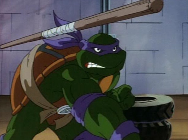 - Donatello: Turtle with the purple bandana who wields a bō staff. He is interested in science and is constantly tinkering with various inventions. He is responsible for the creations of most of the Turtles’ high-tech equipment, including the Turtle Van, the Turtle comms, and the Turtle Blimp. Voiced by Barry Gordon, but is some Season 3 episodes and a Vacation In Europe Side season episode voiced by Greg Berg. A running gag was that most of his inventions exploded or otherwise malfunctioned, but it was still Donatello who came through to save the day most of the time.