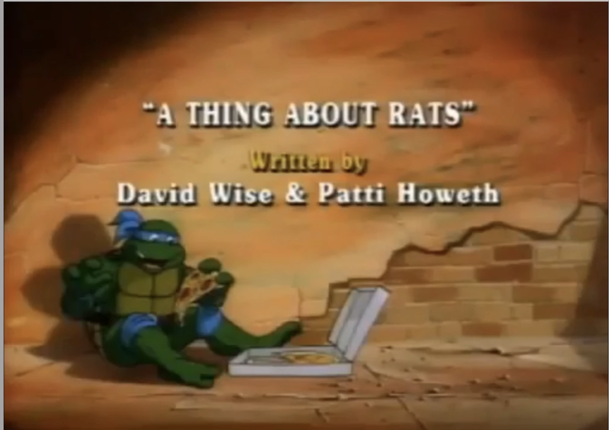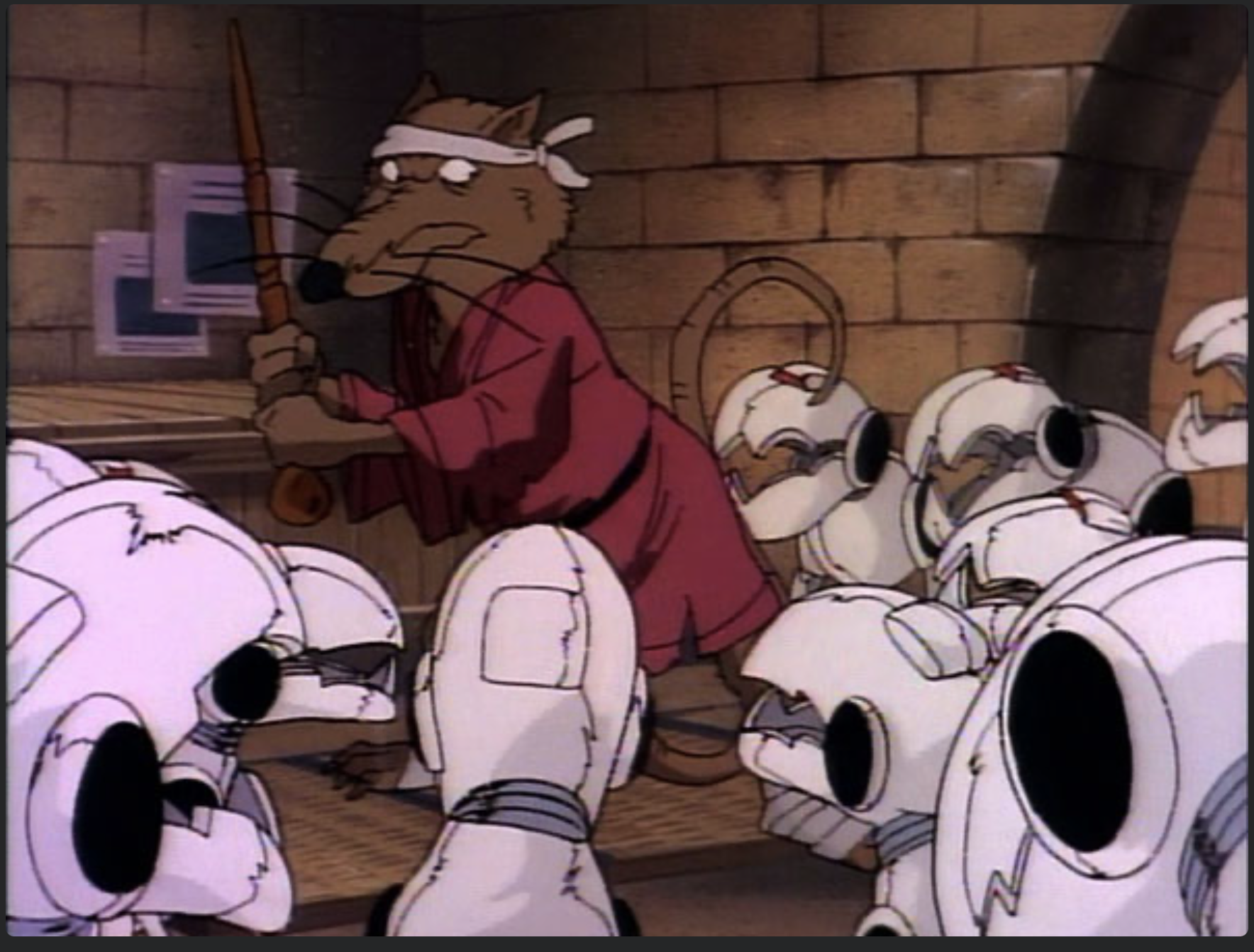 - A Thing About Rats (Season 1, Episode 3) – In the New York City sewers, Splinter recovers from a confrontation with Shredder. The Turtles search for the Technodrome, hoping to force Shredder to transform Splinter from a mutant rat back into a human. In another part of the city, scientist Dr. Baxter Stockman tries to convince the Ajax Pest Control company to invest in his new invention: the Mousers, robots that can catch rats. The president of the Ajax Pest Control company sends Baxter away, saying that the Mousers would cause unemployment for the pest control companies. (Older me found that way too funny.) However, Shredder asks Baxter if they can work together. Back at the deserted mansion where Shredder has set up base, Shredder orders Baxter to create a master control device to control the mouser army he plans to build. (You see where this is going right?)Shredder returns to the Technodrome and begins to mass-produce Mousers. plinter is meditating in the sewers, until he is attacked by twelve Mousers sent by Shredder. With his martial artsskills, Splinter is able to fight off the Mousers one by one, but is outnumbered – until the Turtles, who had sensed Splinter was in danger, arrive and help him defeat the Mousers. Afterwards, they notice that each robot is inscribed with “Baxter Stockman, Inventor.” The Turtles and Splinter visit April O’Neil’s apartment, where she looks up Baxter Stockman on her computer, finding a photograph and his address. The Turtles head for Baxter’s house. Baxter, who has finished the master control device, is followed home by Shredder’s Foot robots because Shredder fears that Baxter “knows too much.” Luckily, the Turtles fight off the Foot robots before Baxter is hurt. The Turtles tie Baxter to a nearby lamp post and Raphael convinces Baxter to divulge that Shredder is at the deserted mansion. Suddenly realizing how easily the Mousers can find Splinter, the Turtles hurry back to April’s apartment. When they arrive, they find April and Splinter using kitchen utensils to fight for their lives against the 1,200 arriving mousers. The Turtles, April, and Splinter all escape the apartment just as the building collapses as a result of the Mousers’ destruction. Is it cheesy? Sure. I enjoyed every moment of it though. They manage to defeat the Shedder. (Michelangelo gets help from Krang.)