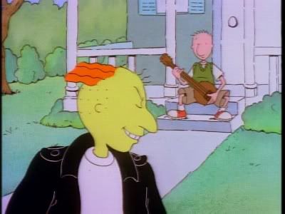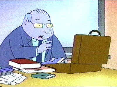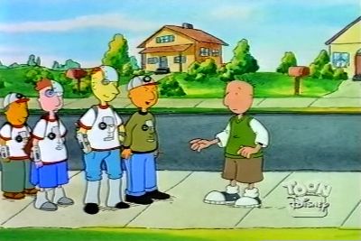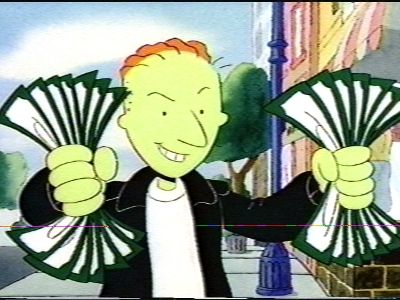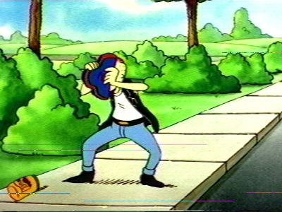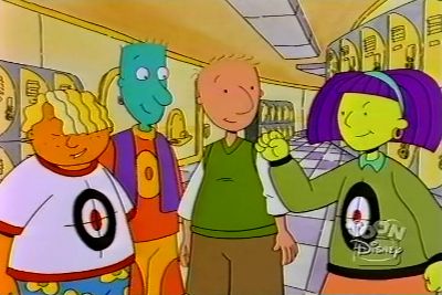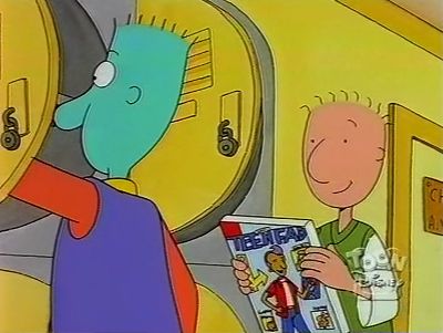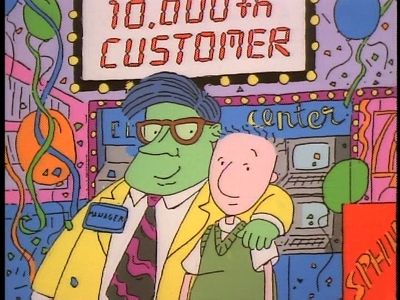 - Doug’s Adventures On-Line – While surfing the internet on the Funnie family’s new computer to find music for the upcoming retro dance, Doug and Skeeter encounter Webster, a ‘kid’ they agree to meet to exchange some records. What the boys don’t know is that Webster is really ‘Friendly Frankie,’ a rather unscrupulous adult. Instead of meeting them, however, Webster/Frankie creates a distraction and steals their records. Horrified, Doug and Skeeter go back online and find similar records for sale at Friendly Frankie’s Used Records. At the store, when the boys try to talk to Frankie about their records, Doug and Skeeter find themselves in a bad situation. Mayor Dink and Mr. Dink rescue Doug and Skeeter and furiously confront Frankie, who is now a criminal. Meanwhile, Judy is online in the ‘Bluffington’s Pretentious Artists Chat Room’, where she meets a guy who uses the screen name ‘Leonardo D’Warhol’. Believing she has met the man of her dreams, Judy arranges a meeting in person only to discover that Leonardo is not quite the man she expected. It warns of the dangers of being online at a time when that was new for everyone.
