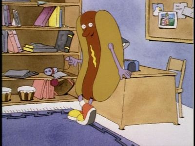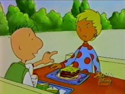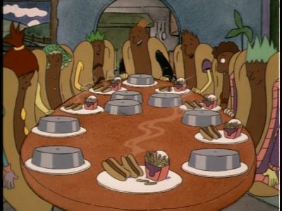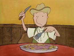 - Doug’s Dinner Date – Patti invites Doug over for dinner with the rest of the gang and Doug is thrilled. It’s a dream come true for Doug until Patti tells Doug she will be serving liver and onions (one of Doug’s most hated foods). Doug tries everything (including hypnosis) to overcome his fear. Patti invites Doug over for dinner Sunday night. Doug is delight, but soon discovers that it’s a group dinner. She also tells him that they are serving liver and onions, which Doug has a blatant aversion towards. So he asks Skeeter to help him practice eating it and invites him over to dinner with his family, adding that he’ll have his mother making him liver tonight. But during the dinner, Doug struggles to try it and just sits there poking at the liver. Doug then realizes that he’s not ready to try the liver and onions yet and excuses himself from the table. In Doug’s room, Skeeter tries to hypnotize him into liking liver and onions, telling him that when he sees liver and onions, he would just see Honker dogs and fries. Doug only manages to hallucinate and see Skeeter as a Honker dog instead. Doug then decides that he has had enough liver and onions for tonight. Doug gets advice from Judy instead. While in her room, Judy suggests that Doug should look through the perspective of the food to understand it. But Doug feels that this isn’t working, and Judy tells him that she has never known anyone getting hysterical over dinner. Later, the night before Patti’s dinner, the Funnie family have dinner at Cowboy Jacques’ House of Boeuf, an Old West-themed restaurant with French staff. (Odd? Yes as odd as it sounds.) After consulting the menu, Doug orders #47 (liver and onions), much to the shock of the customers and Rudy, the waiter. When Doug is presented with his order, he gives it a taste and likes it. He imagines himself as Patti’s prince and outside of his imagination, he gains cheers from everyone at the restaurant. The next day, Doug and Skeeter are walking to Patti’s house and Skeeter is impressed by Doug’s bravery. They arrive at Patti’s house and prepare to have dinner, but Doug, eager to try the liver and onions Patti said she was serving, finds out that Patti was just only joking and she says that she knew about his aversion towards them through his “Things I Hate Most” oral speech in class. He later discovers that they are having Honker dogs and fries instead. A confused Doug once again hallucinates, seeing everyone as Honker dogs right before fainting out of his chair. Poor Doug did all this work for no reason. Check it out here: (https://www.youtube.com/watch?v=HOTmr0kf31E)
