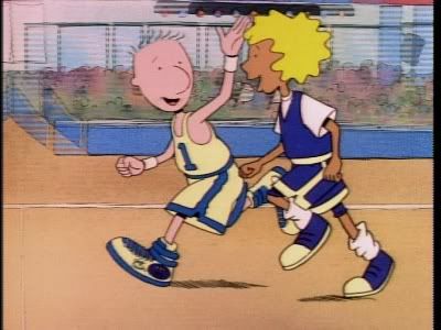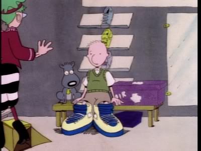 - Doug’s Cool Shoes – Doug and his friends playing basketball against Roger and his gang. Doug is about to shoot a free throw and his team is down one point. Roger insults Doug’s plain shoes to distract him while shooting his free throw. Doug does miss the shot, as well as the ball hitting his head. Doug then realizes how shoes can give a person a headache. (Doug does like to overreact for a 11 year old.) When Doug then feels that he really does need a pair of new shows, he finds Mr. Dink rocking new shoes of his own, which turns out to be computerized too. (Does Dink know how to work any of the stuff he pays for? He was my first introduction to a hoarder.) Doug continues to watch the commercial as the famous basketball player announces that he would be at Four Leaf Clover Mall to autograph his purchased sneakers for the customers. The next day, Doug brings Porkchop along to go to the shoe store and attempts to purchase a pair of Sky Davis Air Jets. The clerk first removes Doug’s old shoes off his feet and places them in a box. She measures Doug’s foot size and runs off to get the famous Air Jets. Doug already begins to miss his old shoes and feels as though he is betraying them. The shoe store clerk returns and offers Doug a final pair of Sky Davis Air Jets, which are too big to fit Doug’s feet. As he walks with the shoes on, Doug starts to feel skeptical at first, but feels like a new man in a new pair of Air Jets. Unfortunately, he only has half the price of the shoes and can’t purchase them. At the end, Roger ends up with the shoes instead, leaving Doug back to his old shoes. As Doug sits outside on the bench moping the next day, Sky Davis (who’s actual name is Chuck) then comes around and compliments Doug’s old sneakers. Doug notices that Chuck is wearing his regular shoes rather than his famous Air Jets, and the latter explains that his regular sneakers are his off-court buddies and that he will never get rid of them no matter what. He autographs Doug’s shoes and Doug reciprocates him by autographing his as well. Roger later challenges Doug one a one-on-one game (while rocking his new Sky Davis Air Jets) and he trips while attempting to hit a shot due to the size of the shoes. Doug grabs the ball and runs to the basket. He hits the shot as his friends cheer for him.