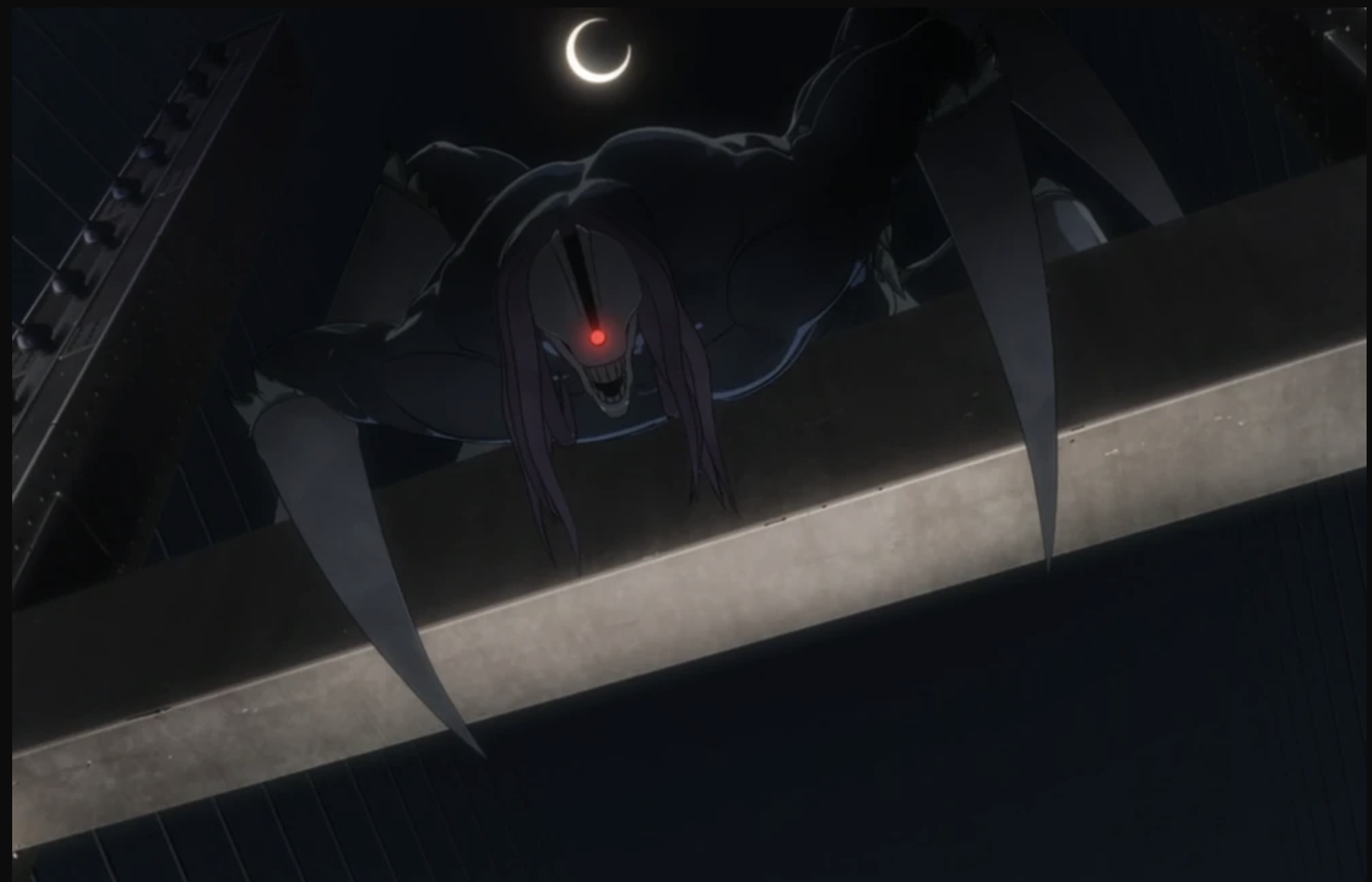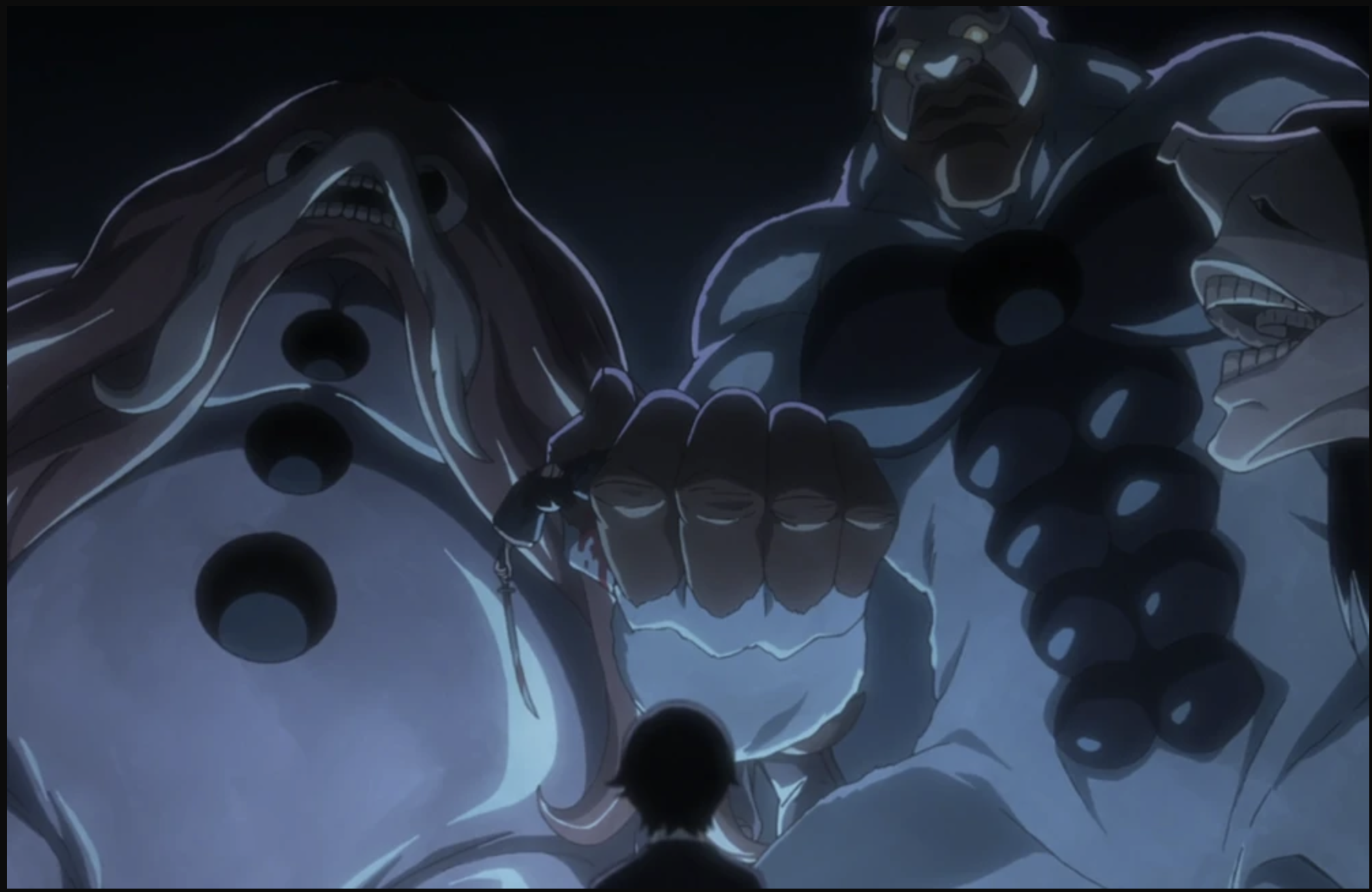- Poor Yuki and Shino – In Karakura Town, a figure crushes and disperses a capsule of Hollow bait on the roof of a building prior to departing (???) as a Senkaimon opens in the air below and Ryūnosuke Yuki and Shino Madarame emerge. They are obviously green and too young to be out and about without a more experienced Soul Reaper. Yuki points out that the rate of Hollow appearances in Karakura Town is high, which makes him question whether he is the right person to be sent in here in addition to the area already having a strong Substitute Shinigami protecting it that leaves him wondering why he is even here. (I too wonder why they are there… It is like lambs to the slaughter to me.) After the two separate, Yuki hears a loud crashing noise and looks up to see a large, mono-eyed Hollow with four legs grinning down at him while the traffic lights on the nearby streets change from green to red, prompting a screaming Yuki to leap down to the ground below and begin running while the Hollow drops down behind him and begins chasing after Yuki. Calling Shino on his Denreishinki and frantically telling her that a Hollow is here but she doesn’t respond. Yuki hauls ass away from the hollows while continuing his attempts to reach Shino, only to stop in shock upon reaching the roof of the building, where he sees a bloodied and motionless Shino being held by another large, ape-like Hollow, who is flanked by two others and stares down at a terrified Yuki.