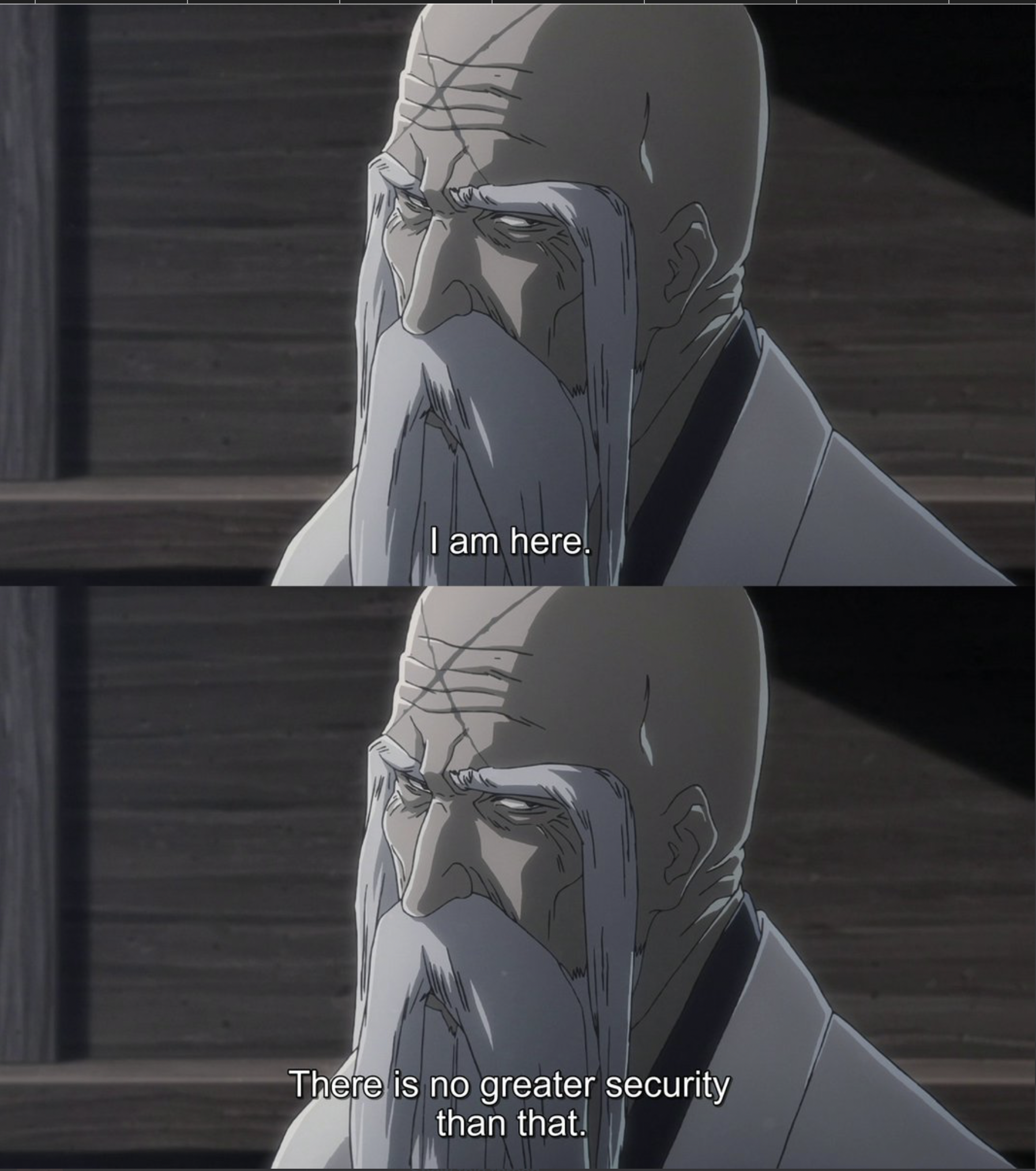 - War is Declared on Yamamoto and the Gotei 13 – These intruders just come into this Captain Commander’s house declaring war and killing people and ish… Captain-Commander Genryūsai Shigekuni Yamamoto stands in his office, where he notices a flash of energy from the Seireitei outside and recognizes it in astonishment as the power of his lieutenant, Chōjirō Sasakibe. Suddenly, a Shinigami attempting to report to Yamamoto is decapitated, leading Yamamoto to turn around and find seven masked individuals standing across from him at the other end of the room. What kind of people run up on Yamaji? Are they nuts? They state that they have come to declare war…. points out how easy it was to infiltrate the office of the Captain-Commander and questions if Yamamoto’s security is lax, but Yamamoto simply proclaims that there is no greater security than his own presence, which they acknowledge. They are interrupted when Chōjirō is impaled and pinned to the wall by a massive Reishi javelin. assures him that he does not need to mourn for Chōjirō, who has demonstrated the fate of a hopeless death following a desperate struggle that is destined for all of the Shinigami, before proclaiming that the Wandenreich will annihilate Soul Society in five days. They infer that Yamamoto wants to know who they are and refuses to tell him since he should already know prior to Shadows enveloping him and the other six individuals. Even with knowing what was going to happen here, I was still shocked at the way it unfolded for some reason… They really brought to life what was on the page.