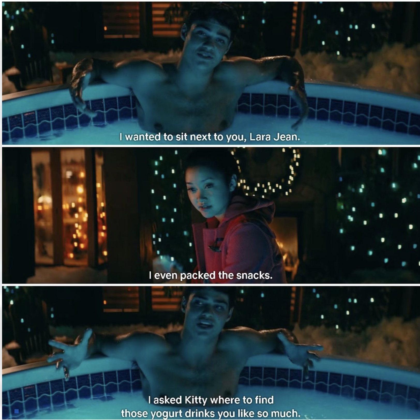 LJ thinks Peter is so out of line, but she can’t shake the feeling that he might be right. LJ has always known she couldn’t have him (based on… what exactly???) Why didn’t she tell him the truth—that she likes him—when he expressed the same? I don’t have an answer and neither does she. He’s not just a handsome boy. Lara Jean decides to be brave and fall in love, so she heads for the hot tub. FINALLY GIRL. Since curfew is in 15 minutes, she hopes Peter is still there before she loses her nerve. He’s alone in the hot tub and seems perplexed as she takes her coat off and sits on the edge of the hot tub, putting in just her feet. She says she didn’t know what to say earlier, but she likes him. Peter says he doesn’t understand girls, and Lara Jean wonders if she messed everything up. She scoots closer and kisses him—and Peter kisses her back. He pulls her onto his lap in the water. LJ kisses Peter again. For her, kissing feels amazing. Finally, Peter says they should go back to their rooms; it’s after curfew. Lara Jean is freezing as soon as she stands up, so Peter towels her off and helps her into her coat. They kiss before they part ways.