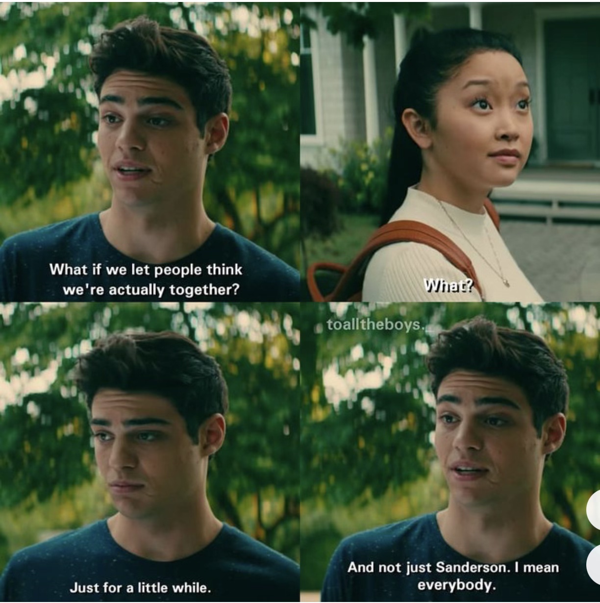 I run up to Peter and launch myself into his arms like a shot out of a cannon. I’ve got my arms around his neck and my legs hooked around his waist, and I don’t even know how my body knows how, because I’ve for sure never touched a boy like this in my life. It’s like we’re in a movie and the music is swelling and waves are crashing around us. Except for the fact that Peter’s expression is registering pure shock and disbelief and maybe a drop of amusement, because Peter likes to be amused. Raising his eyebrows, he says, “Lara Jean? What the–?”