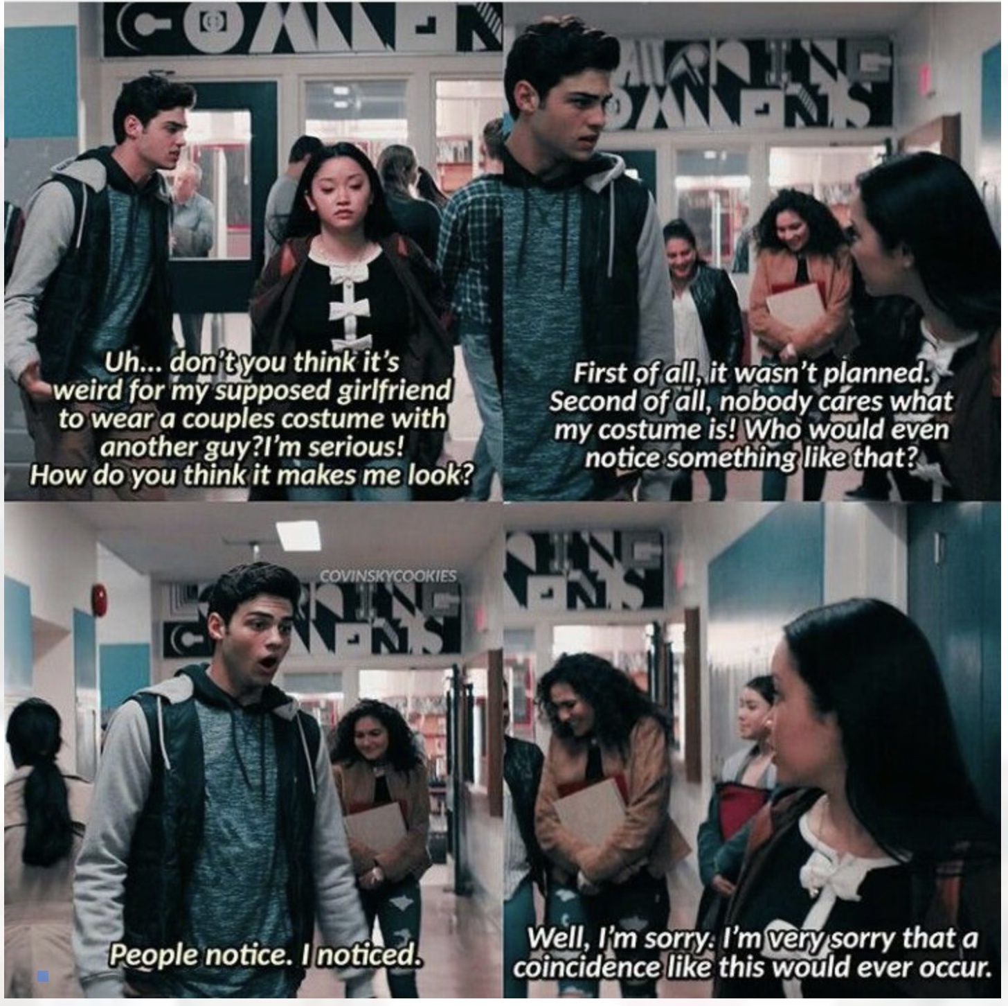 Chris (dressed as Courtney Love) and Lara Jean sit in the theater balcony during the costume judging. Peter and his friends are dressed as superheroes; Peter is Spiderman. Genevieve is Catwoman. Peter and his friends win for best group costume, and Genevieve wins best individual costume for her grade. This signifies to LJ that Peter and Gen are better suited to one another and that they are in a different stratosphere than her in regards to high school popularity. (Not sure she ever thought about it before. But now it seems to be glaringly obvious. But I would point out that, this wouldn’t bother her so much if she didn’t really like Peter.) After the assembly, Peter finds Lara Jean at her locker. Just then, Josh walks by and pretends to shoot a spell at Lara Jean. Lara Jean retaliates with a spell of her own. Then, Peter says it’s “weird” that Lara Jean is wearing a couple’s costume with someone else. (Well there it is… most people would draw that conclusion… LJ rolls her eyes, but she says it wasn’t planned and, anyway, nobody cares about her costume. For some reason, she kind of brushes it under the rug… Earlier, she was annoyed and wanted him to acknowledge that. And now she is downplaying Peter. Peter is adamant that people notice that Lara Jean is dressed like Josh, but Lara Jean insists she has no choice. If she dresses as anyone else, they’ll think she’s a manga character. Peter says he could’ve been a Harry Potter character if they’d talked about it. And here is an instance where communication is key. If you had asked him… he would have done with you/ for you. (Something that I maintain is the exact opposite of who Margot makes him out to be.)