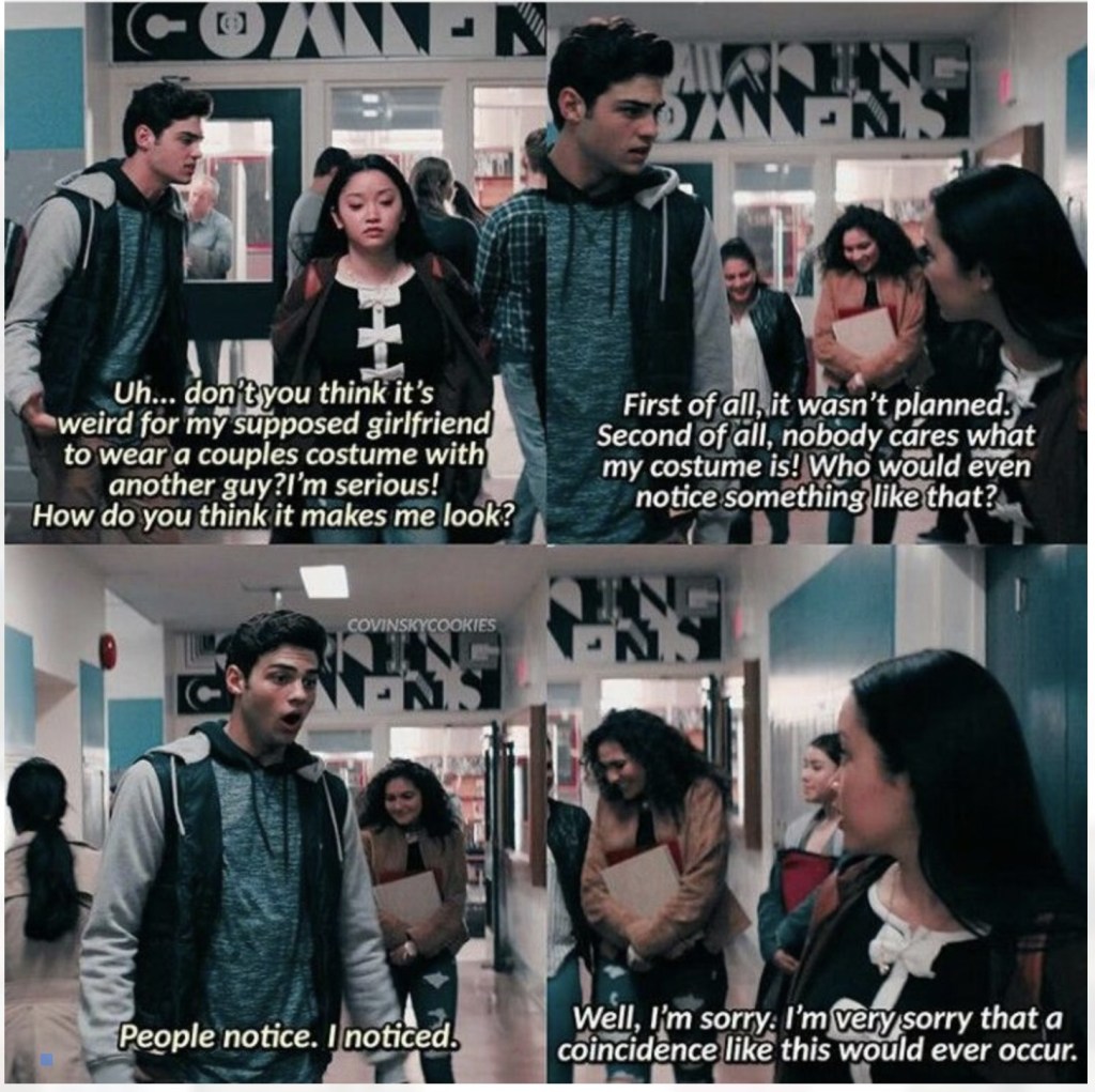 For Halloween… LJ is in a dilemma coming up with a costume. (I know this dilemma first hand. There is not a lot of choices when it comes to cosplay or characters to dress up as for halloween as a Black woman. And then people not getting what you do choose because of your race or nationality.) Lara Jean was Velma from Scooby-Doo last year, and everyone thought she was a manga character. Now, she’s decided to stick with Asian characters, so this year she’s dressed as Cho Chang from Harry Potter. As she waits for Peter before school, Josh comes out of his house—dressed as Harry Potter. They both laugh, and Josh offers to take Lara Jean to school, but she declines. Even though this is a coincidence… supposedly… (Given Josh’s behavior up to this point, I wonder.) It doesn’t look great… and I had the feeling that Peter would be annoyed. Peter is late, as usual. As LJ gets into his car, he asks if she’s an anime character. (Hear a loud groan from me.) Lara Jean snaps that she’s Cho Chang, but Peter gives her a blank look. (Apparently, they are vastly different and there is nothing wrong with that… but it doesn’t help that Peter does exactly what LJ was hoping against.) He’s not dressed up; and Lara Jean doesn’t ask what his costume is. She’s angry, and he doesn’t ask what’s wrong. Finally, she snaps that she wishes he wasn’t always late. They argue, and Lara Jean says she’s not going to ride with him if he’s late. (But is that really the issue? No. But I need them to communicate better which for YA’s takes time.)